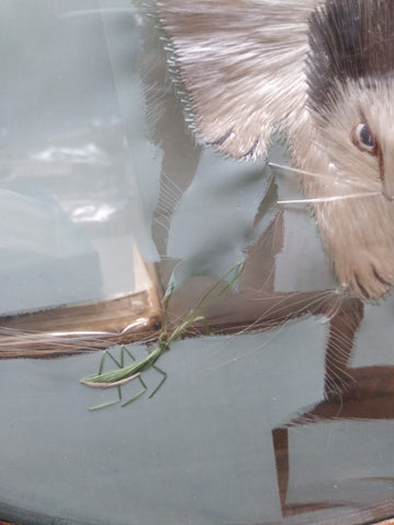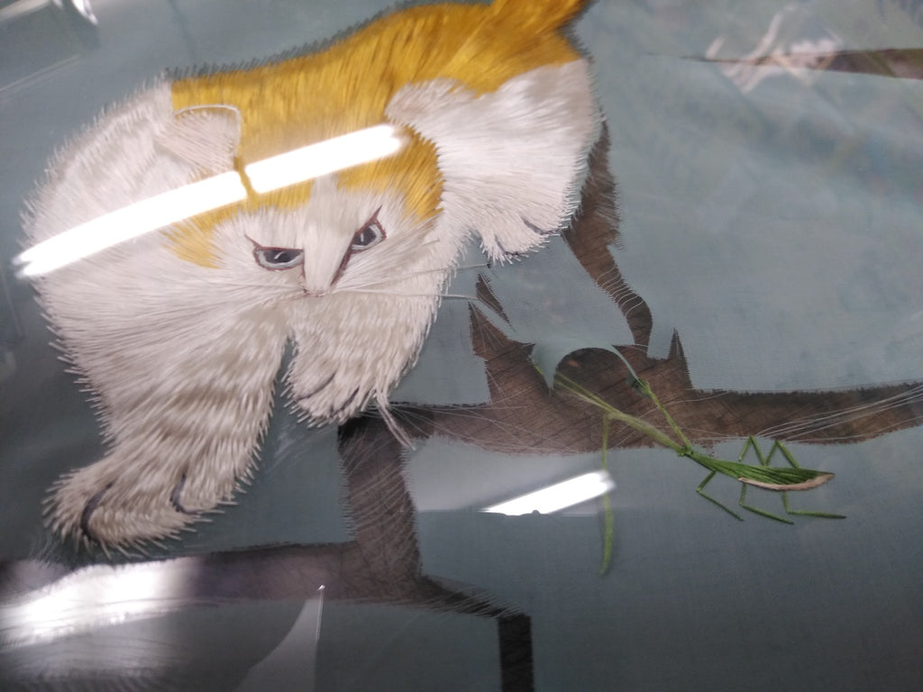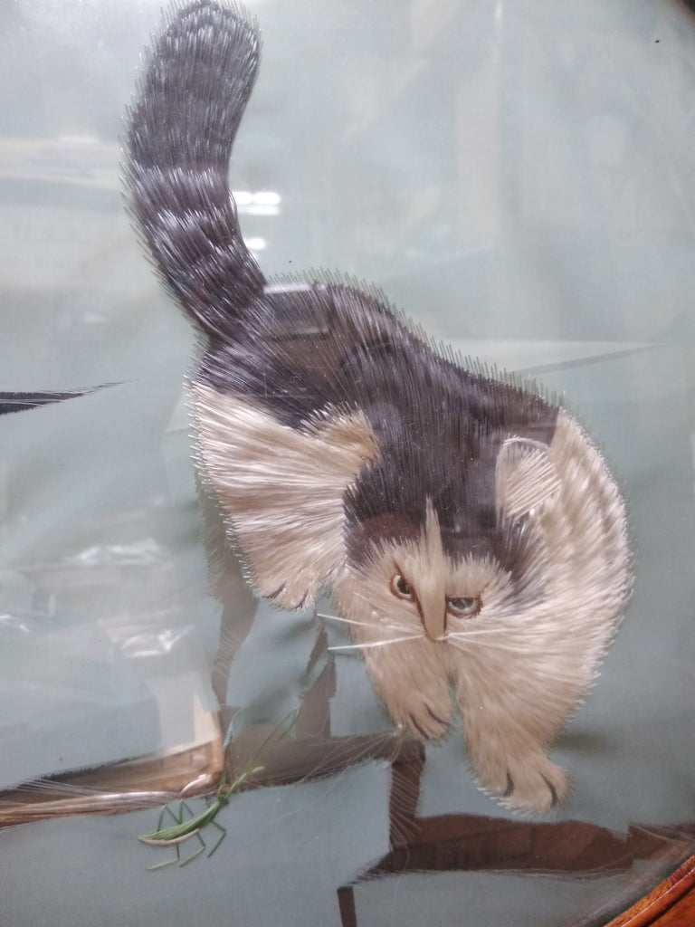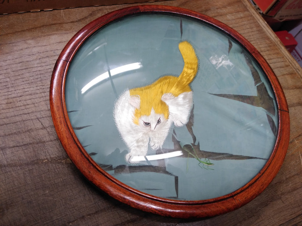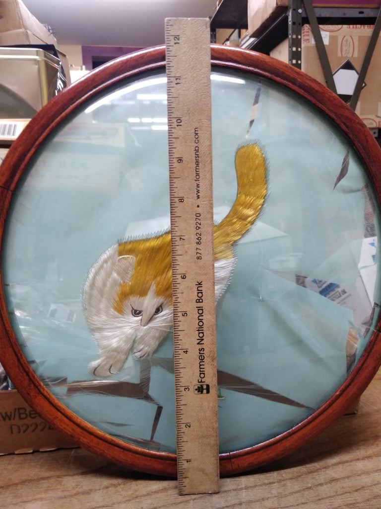 This is a Vintage and Unique 2 Sided Silk? Cat Picture Hunting Praying Mantis Gold Gray Round Convex Glass 12" Diameter. Pretty sure this is Silk but not certain. There are some issues with the fabric but thought it may be restored. The pictures are a substantial part of the description so please examine all the photos and contact me if you have any questions. We will be happy to save you shipping costs by picking this up at our shop. Thank You 081524- RK-01