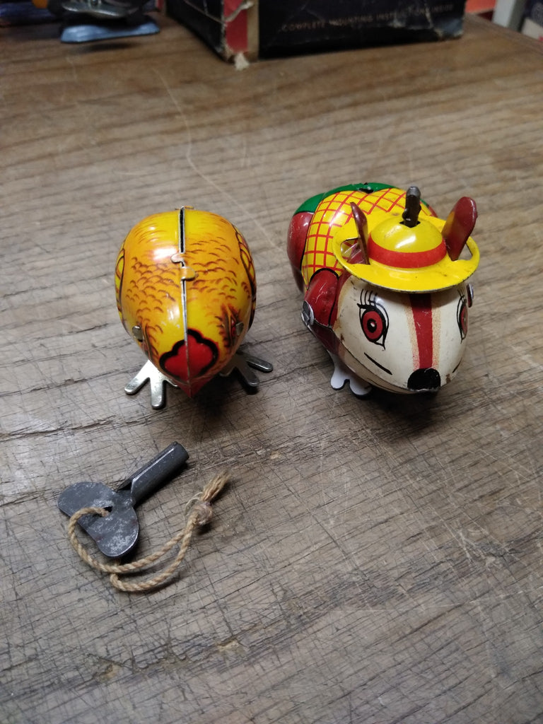 This is a Vintage 2 Wind Up Hopping Mouse and Chick Litho Tin Toys Lot, Yone, Made In Japan and China, with Key. Working and in Decent Shape!   *** Selling as pictured as is. The pictures are a substantial part of the description so please examine all the photos and contact me if you have any questions. We will be happy to save you shipping costs by picking this up at our shop in Butler, Pa. Thanks for looking.  050924- RK-04