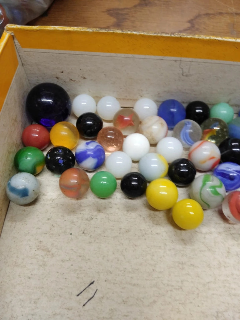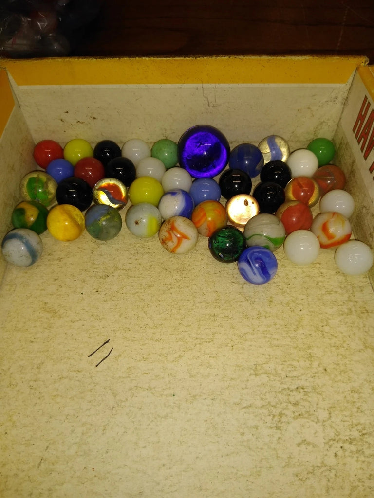 This is a 40+ Piece Glass Marble Lot with older and newer marbles, they may include Shooters, Swirls, Cats Eye, Vitro, Agate and More! I'm not a marble guy so I don't really know what types these are, I'll have to leave all that up to you. Cigar box not included. Be sure to read all condition descriptions. The pictures are a substantial part of the description so please examine all the photos and contact me if you have any questions. We will be happy to save you shipping costs by picking this up at our shop. Thanks for looking. 090421