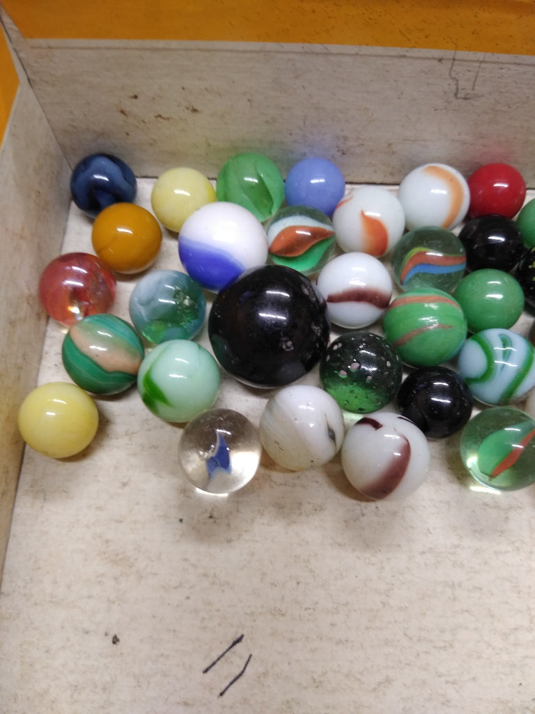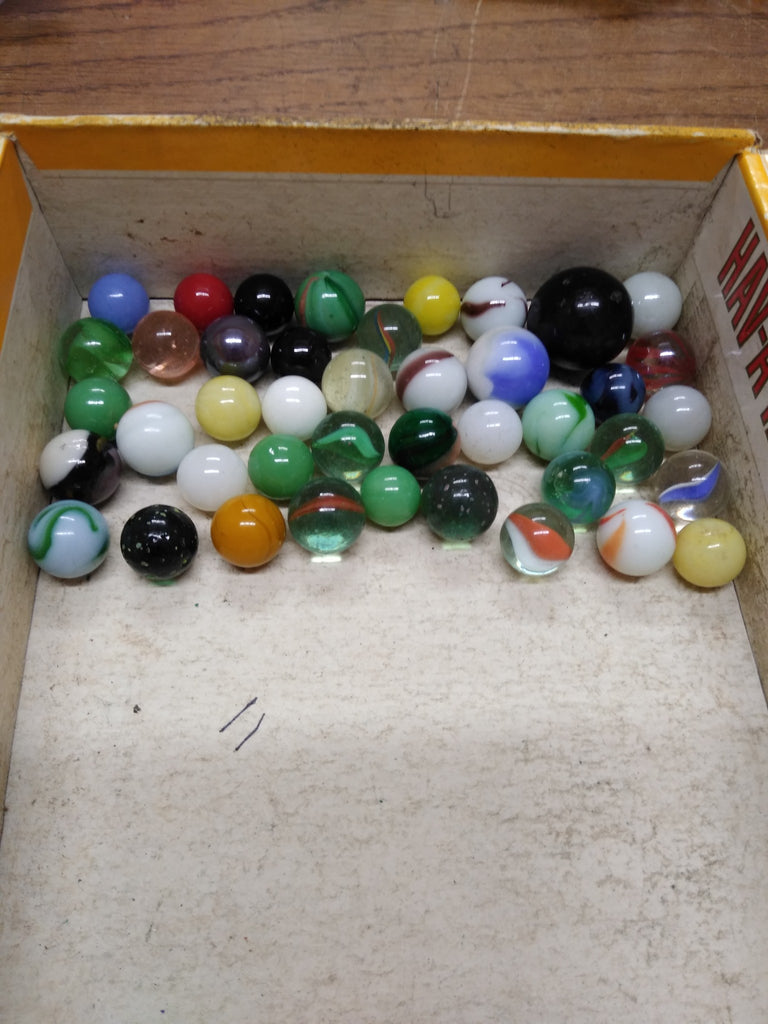 This is a 40+ Piece Glass Marble Lot with older and newer marbles, they may include Shooters, Swirls, Cats Eye, Vitro, Agate and More! I'm not a marble guy so I don't really know what types these are, I'll have to leave all that up to you. Cigar box not included. Be sure to read all condition descriptions. The pictures are a substantial part of the description so please examine all the photos and contact me if you have any questions. We will be happy to save you shipping costs by picking this up at our shop. Thanks for looking. 090421