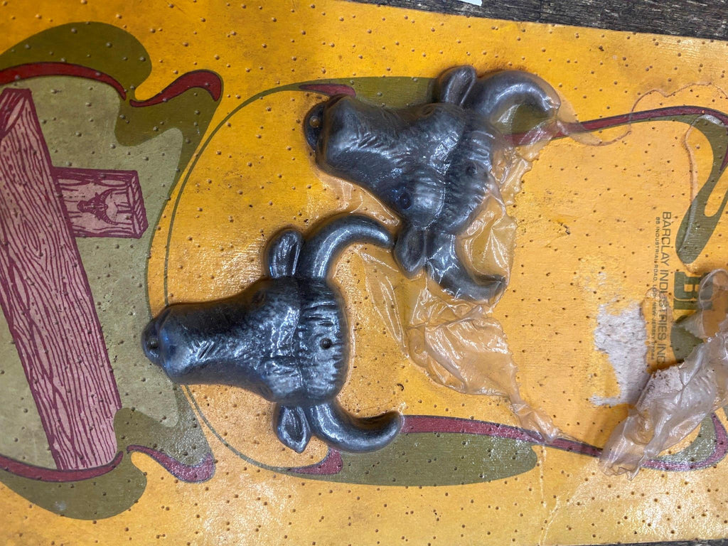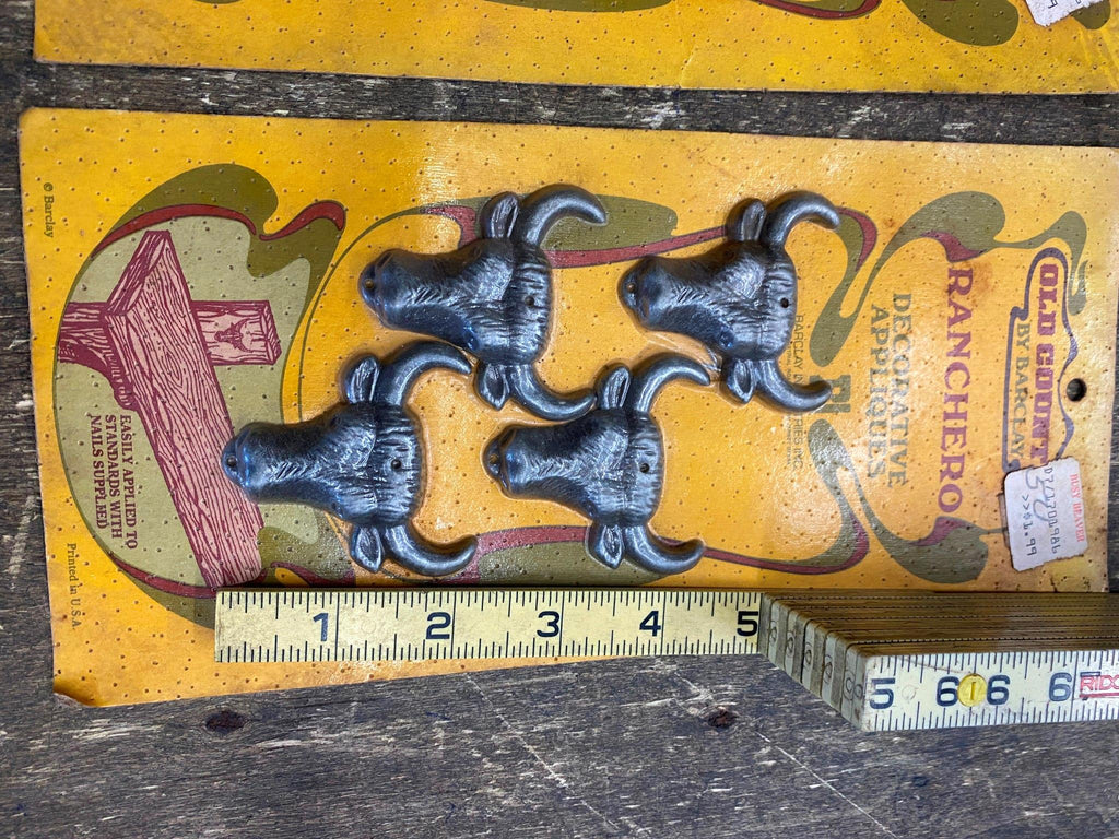 Vtg 50's Carded Barclay Toys Steer Head Decor Metal Saddlebag Western Holster Hat wagon shed etc..... or just hang them on the wall in the card!!