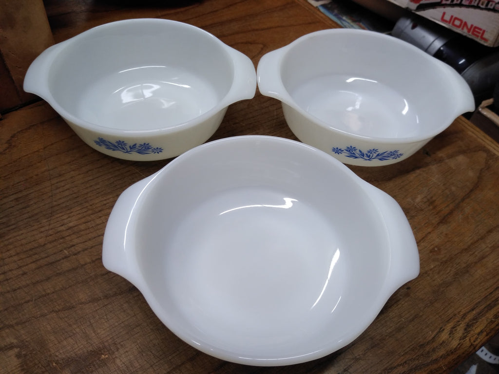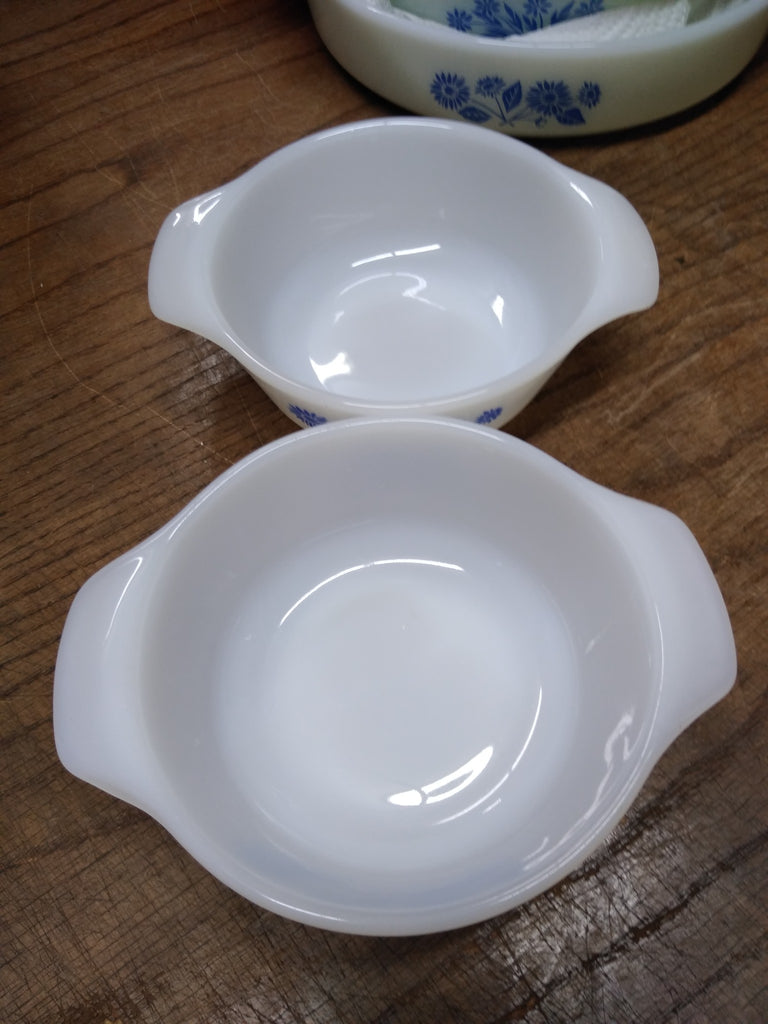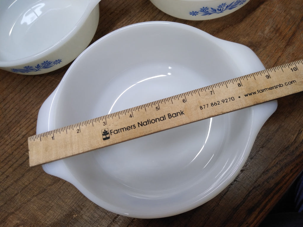 ***PLEASE LOOK AT ALL THE PICTURES AND ASK QUESTIONS BEFORE BUYING*** This is a Vintage 6 Pc Lot Anchor Hocking Fire King Milk Glass Blue Cornflower 1x 9", 3x1Qt, 2x12Oz, Very Good condition, Made In The USA! Please Check Condition Description for more information.