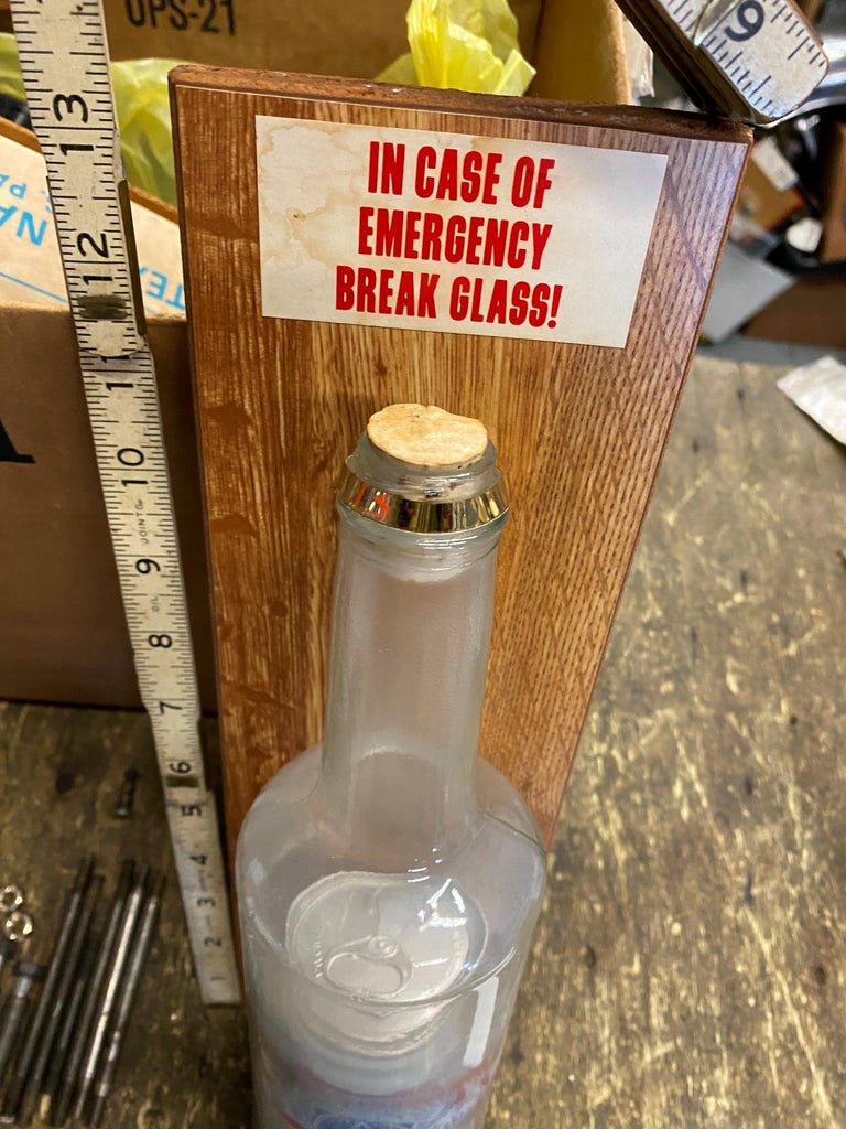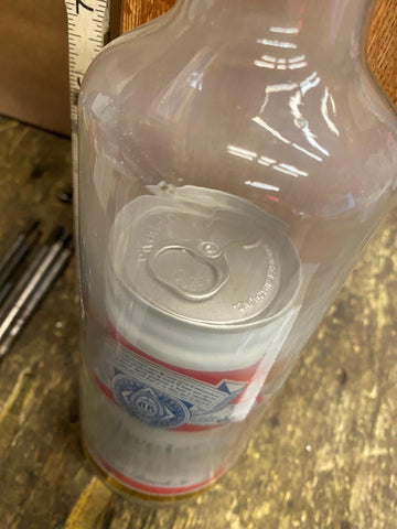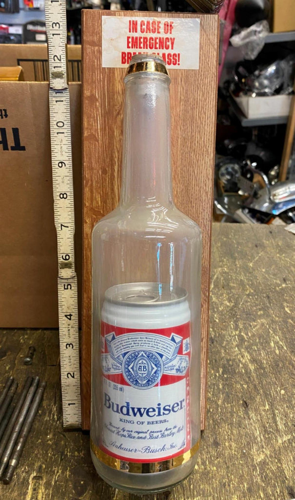 Vtg 70s Budweiser "In Case of Emergency Break Glass" bottle. Mancave bar collectible Sign! Real glass bottle. Old pull tab can! Great Piece of advertising for the collector!!! Man cave tavern! How do they get the can in the bottle?????