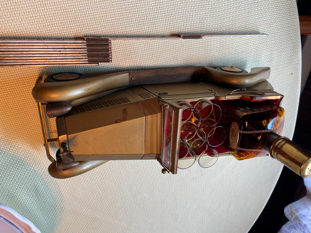Vtg 70s Car Rolls Royce Gin Scotch Decanter Shot Glasses Music Box "How Dry I Am"   lift the bottle out &it plays music     Cool little item for the bar!!