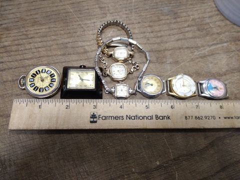This is a Vintage 8 Piece Ladies Wrist Watch Parts/Repair Lot with Croton, Medana, Benrus, Heritage, American Heritage, Lunox, Manson and Timex. There was at least 1 watch that was working at the time of taking these pictures, not sure which one .