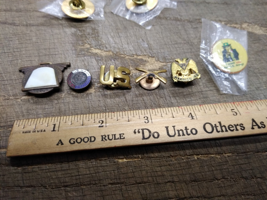 ***PLEASE LOOK AT ALL THE PICTURES AND ASK QUESTIONS BEFORE BIDDING*** This is a Vintage 8 Pc Lapel Hat Pin Lot 32 Masonic Navy Honorable Discharge I Want You Army++ *** The pictures are a substantial part of the description so please examine all the photos and contact me if you have any questions. We will be happy to save you shipping costs by picking this up at our shop. Thank You 061725- RK-04