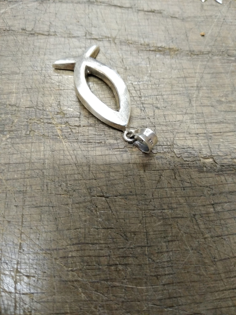 ***PLEASE LOOK AT ALL THE PICTURES AND ASK QUESTIONS BEFORE BUYING*** This is a Vintage 925 Sterling Silver Christian Fish Ichthys Necklace Pendant, Charm 1.5 inch! *** Selling as pictured as is. The pictures are a substantial part of the description so please examine all the photos and contact me if you have any questions. We will be happy to save you shipping costs by picking this up at our shop in Butler, Pa. Thanks for looking. 050924- RK-09