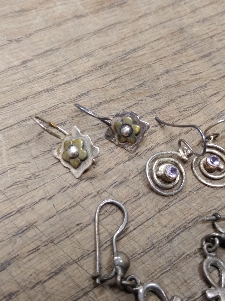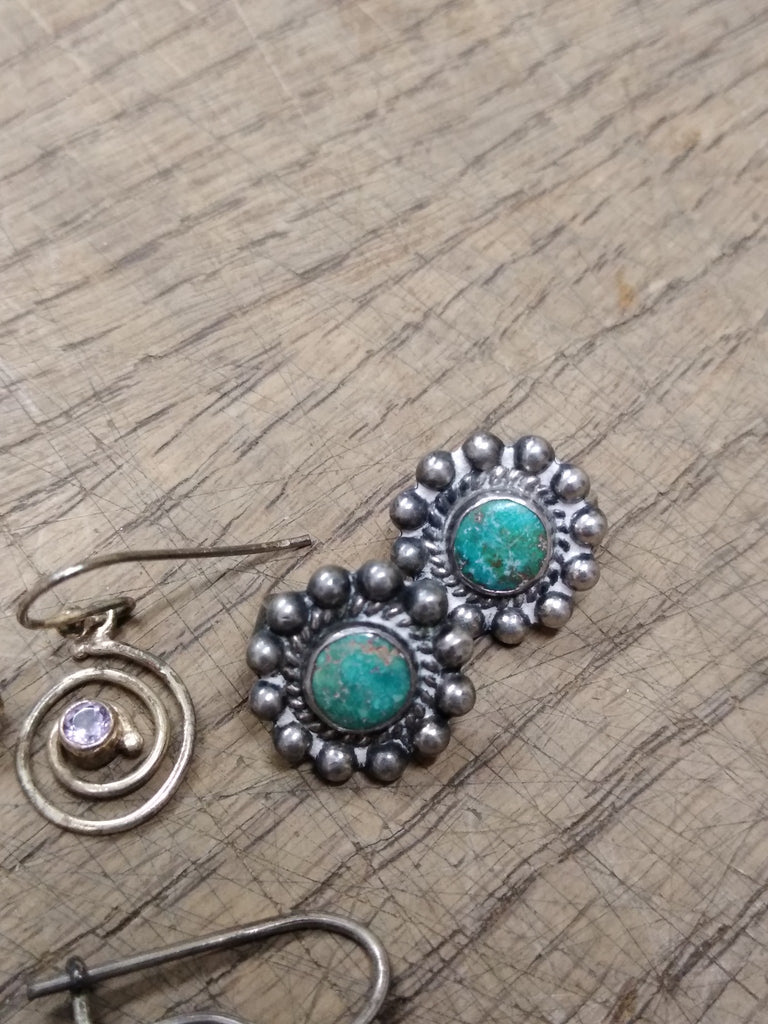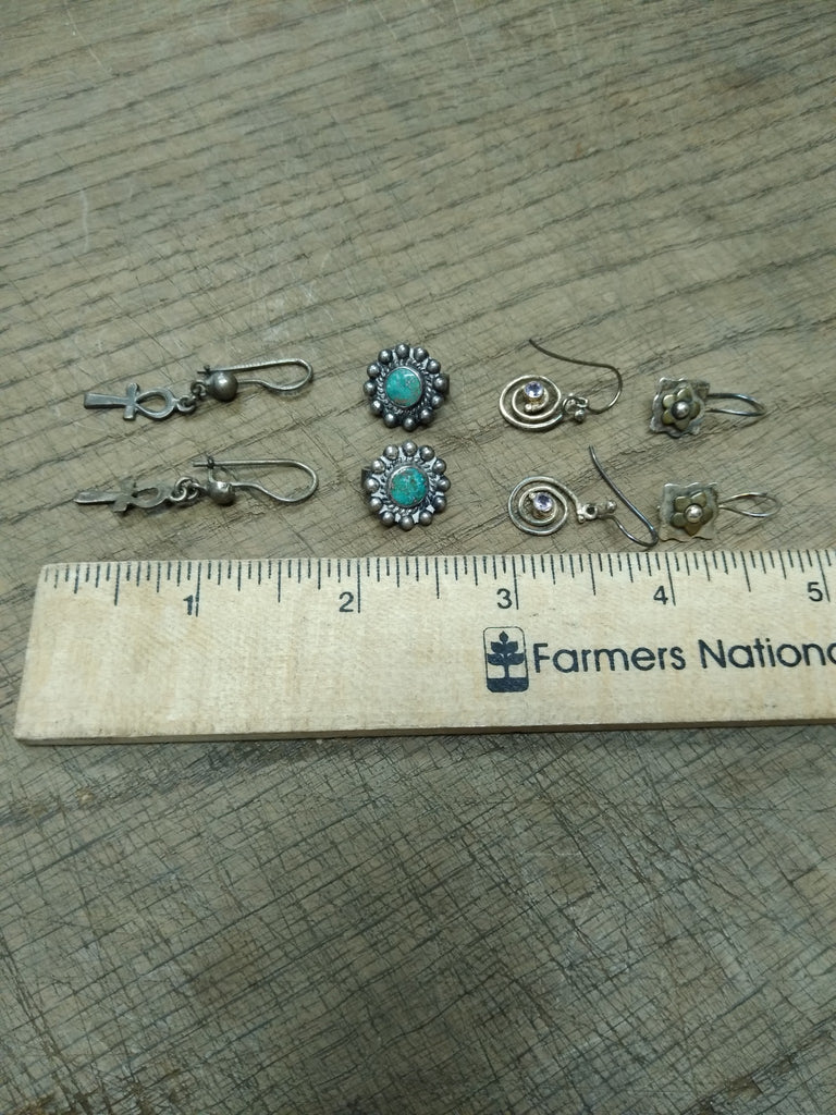 ***PLEASE LOOK AT ALL THE PICTURES AND ASK QUESTIONS BEFORE BUYING*** This is a Vintage 4 Pair 925 Sterling Silver Earring Lot with Modernist and Southwest Styles, and Amethyst?, Turquois? Stones (Not sure of the stone types) in Good Condition!!!!!!!****** The pictures are a substantial part of the description so please examine all the photos and contact me if you have any questions. We will be happy to save you shipping costs by picking this up at our shop. Thanks for looking. 122623- RK-07