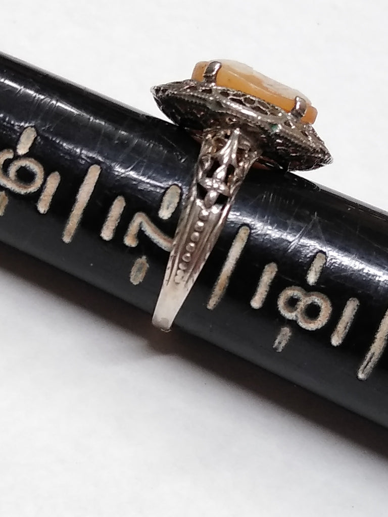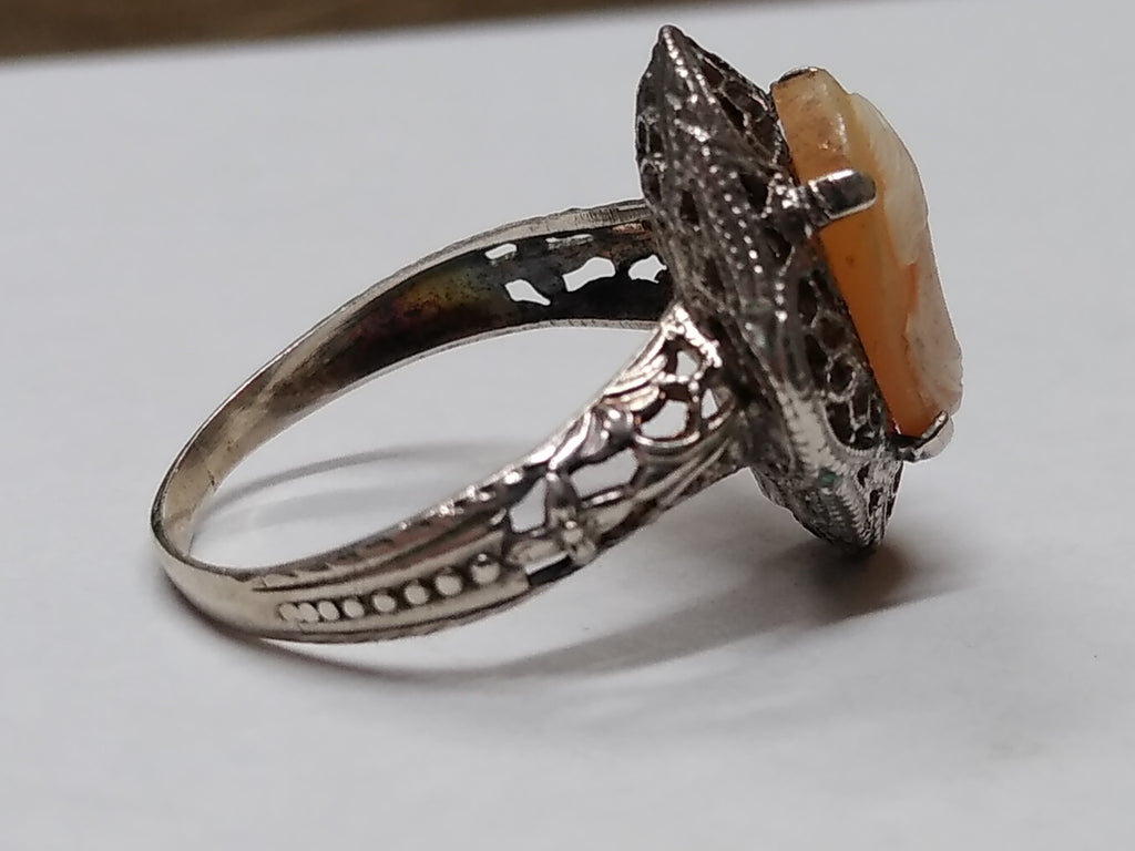 ***PLEASE LOOK AT ALL THE PICTURES AND ASK QUESTIONS BEFORE BIDDING*** This is a Vintage Antique 925 Sterling Silver Filigree Cameo Ring Size 7.25 Carved Shell Right Facing Nice Shape!!! ***925 marks and brand are worn off, tested as 925 *** The pictures are a substantial part of the description so please examine all the photos and contact me if you have any questions. We will be happy to save you shipping costs by picking this up at our shop. Thank You 092525-06-RK
