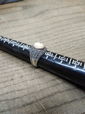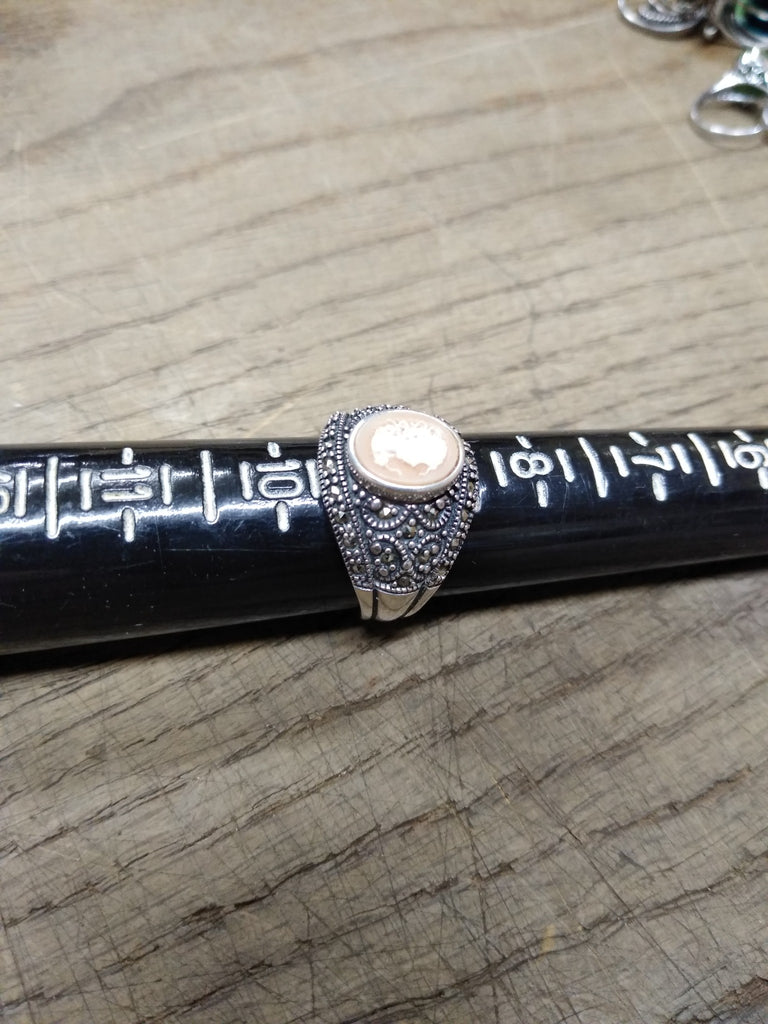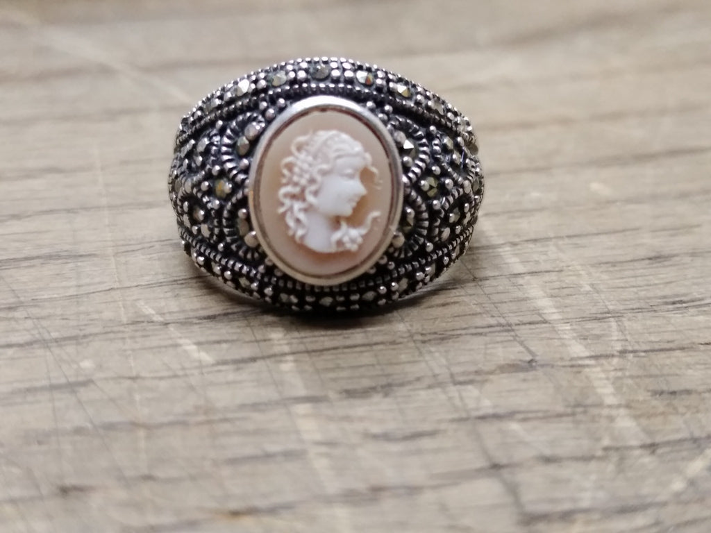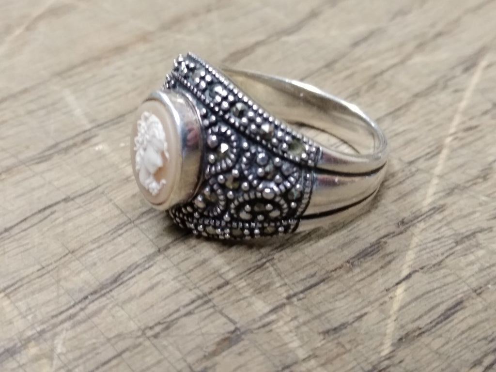 ***PLEASE LOOK AT ALL THE PICTURES AND ASK QUESTIONS BEFORE BIDDING*** This is a Vintage 925 Sterling Silver Right Facing Cameo w/Marcasites Size 9 Ring, Missing 1 stone but Very Nice!! *** The pictures are a substantial part of the description so please examine all the photos and contact me if you have any questions. We will be happy to save you shipping costs by picking this up at our shop. Thank You 090225-10-RK