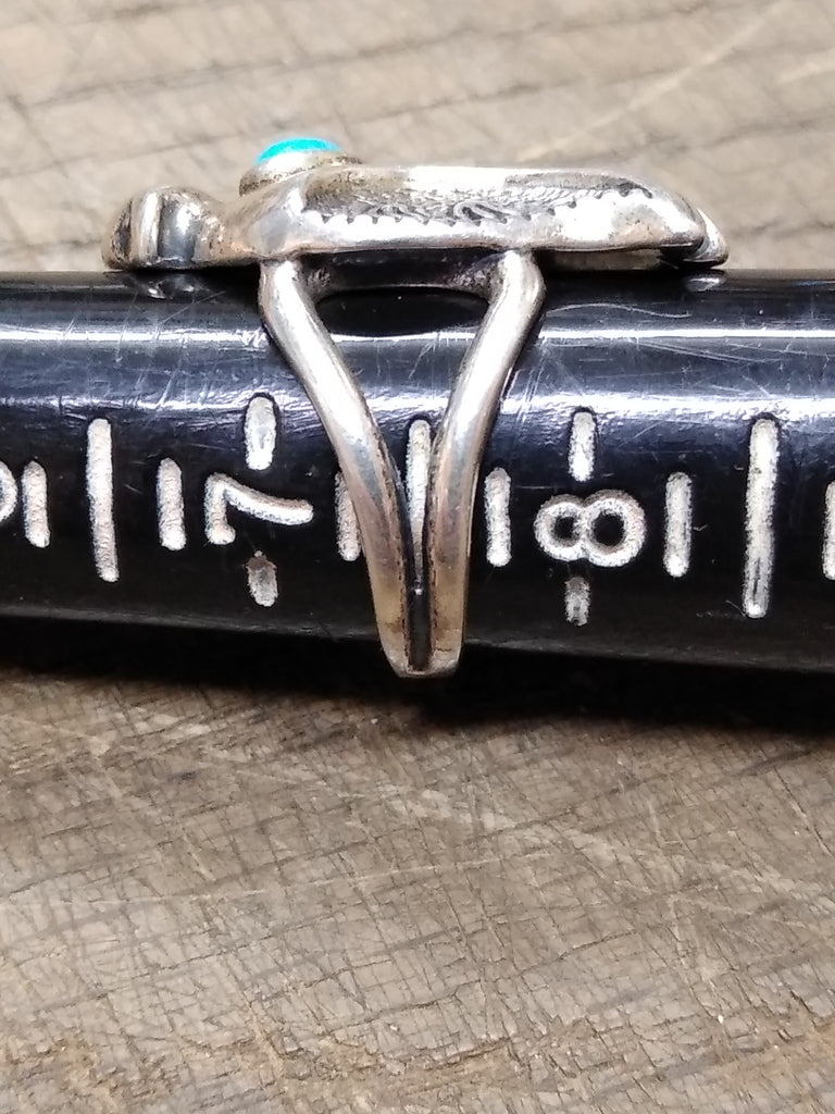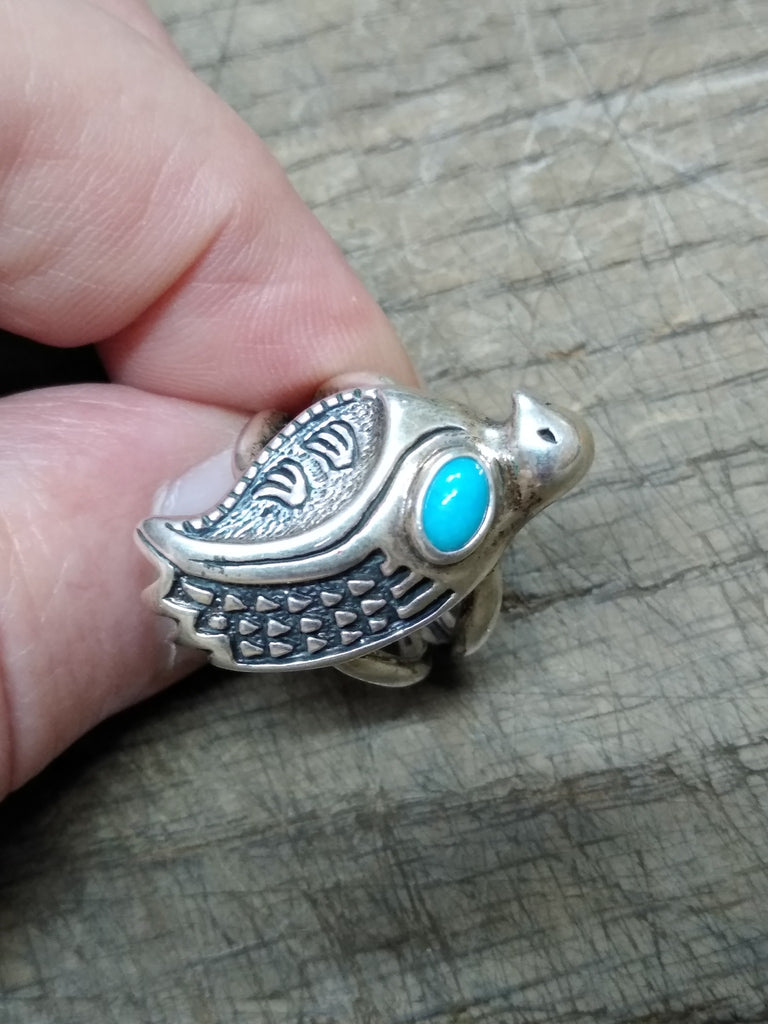 ***PLEASE LOOK AT ALL THE PICTURES AND ASK QUESTIONS BEFORE BIDDING*** This is a Vintage 925 Sterling Silver Turquoise Size 7.5 Dove Ring Native American Tested Beautiful!! *** The pictures are a substantial part of the description so please examine all the photos and contact me if you have any questions. We will be happy to save you shipping costs by picking this up at our shop. Thank You 093025-17-RK