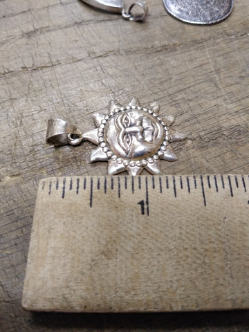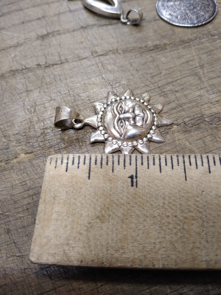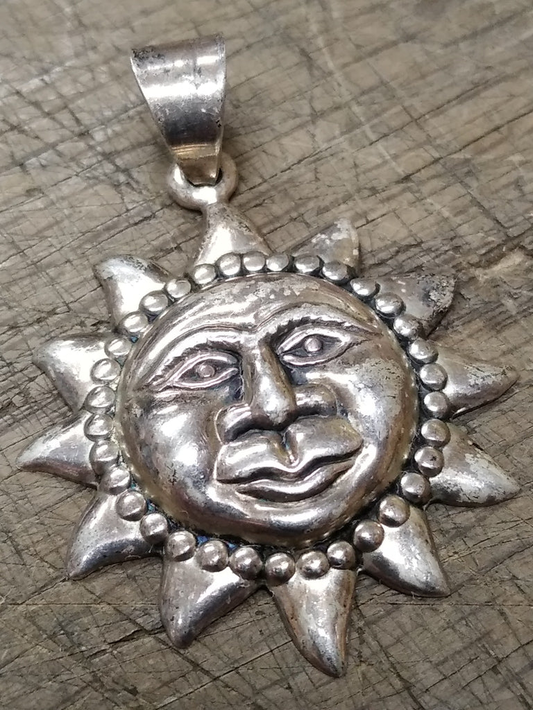 ***PLEASE LOOK AT ALL THE PICTURES AND ASK QUESTIONS BEFORE BUYING*** This is a Vintage 925 Sterling Silver Smiling Sun Face Necklace Pendant, Charm 1 3/8 inch!   *** Selling as pictured as is. The pictures are a substantial part of the description so please examine all the photos and contact me if you have any questions. We will be happy to save you shipping costs by picking this up at our shop in Butler, Pa. Thanks for looking.  050924- RK-11