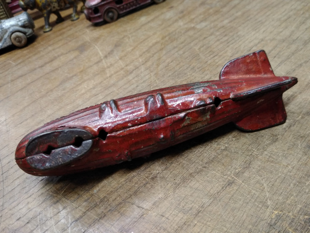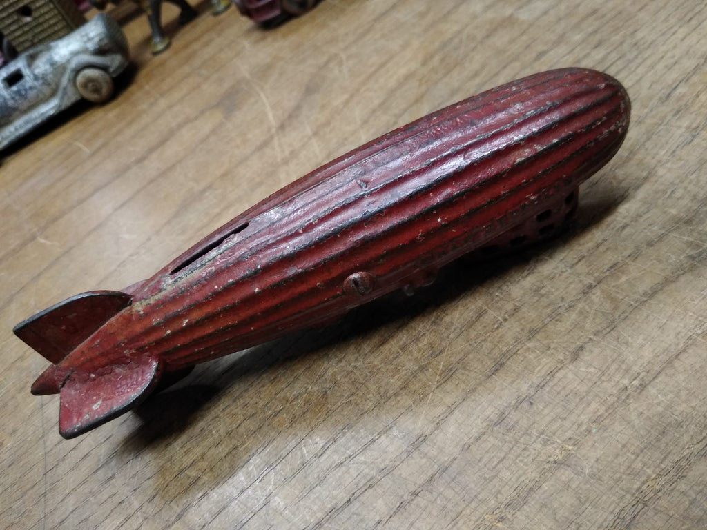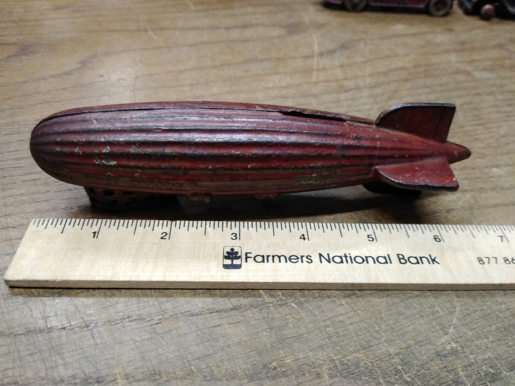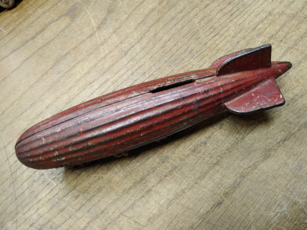 ***PLEASE LOOK AT ALL THE PICTURES AND ASK QUESTIONS BEFORE BUYING*** This is a Vintage Cast Iron Graf Zeppelin Coin Bank with Original Red Paint and a Nice Patina, Possible, AC Williams . Needs wheels. The pictures are a substantial part of the description so please examine all the photos and contact me if you have any questions. We will be happy to save you shipping costs by picking this up at our shop. Thanks for looking. 022123- RK-07