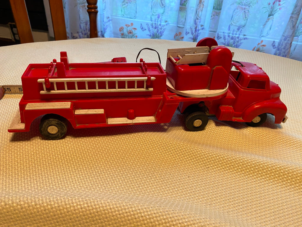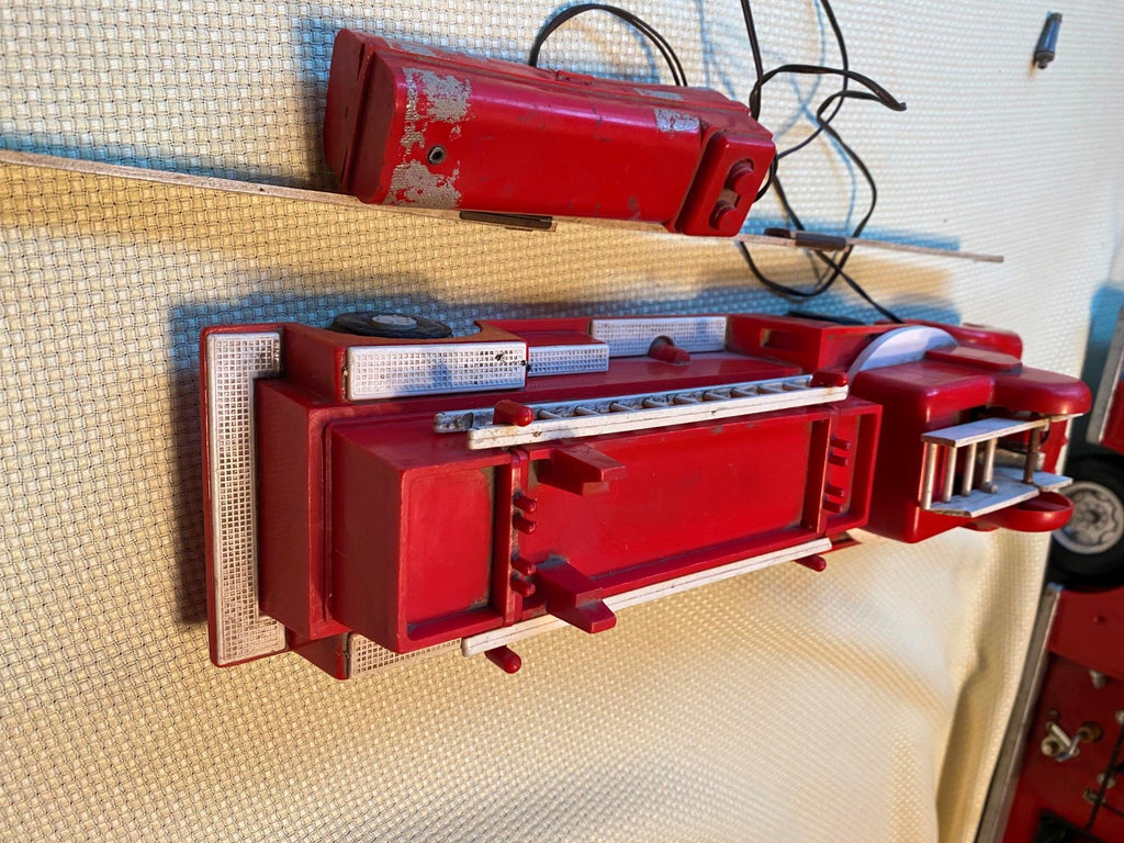 Vtg Andy Gard toy fire truck. Battery Remote RC 50's Toy. Hard plastic 15" Ladder. Pretty clean. Looks like ladder broke off, untested. Selling off a large collection of toys!!