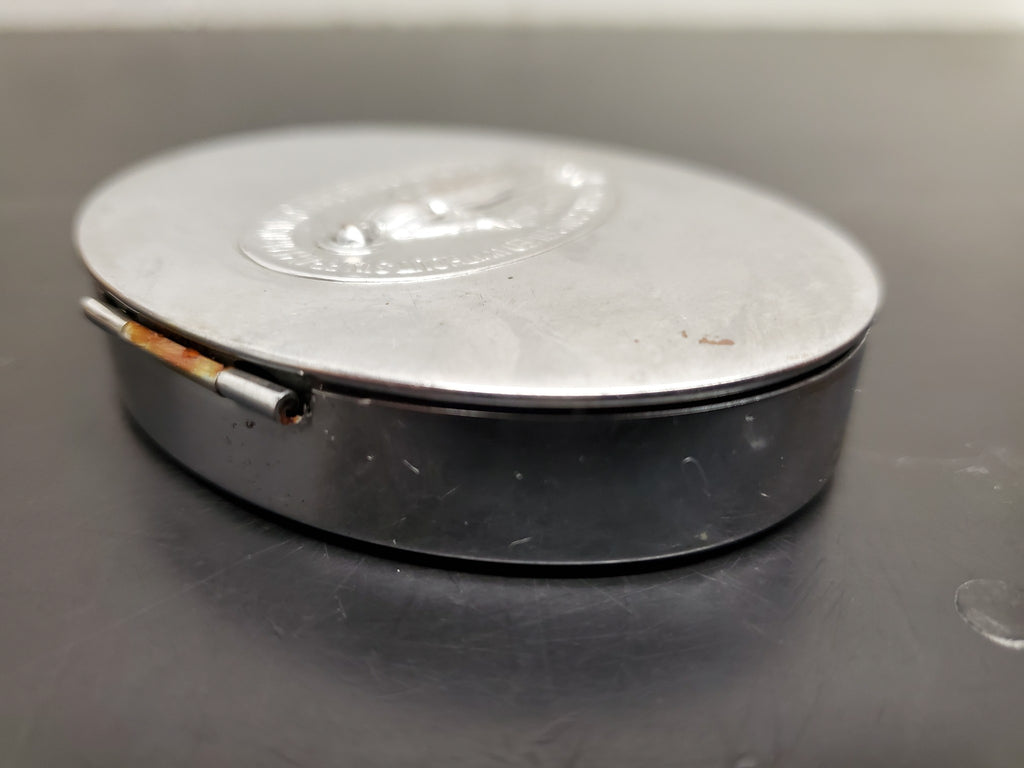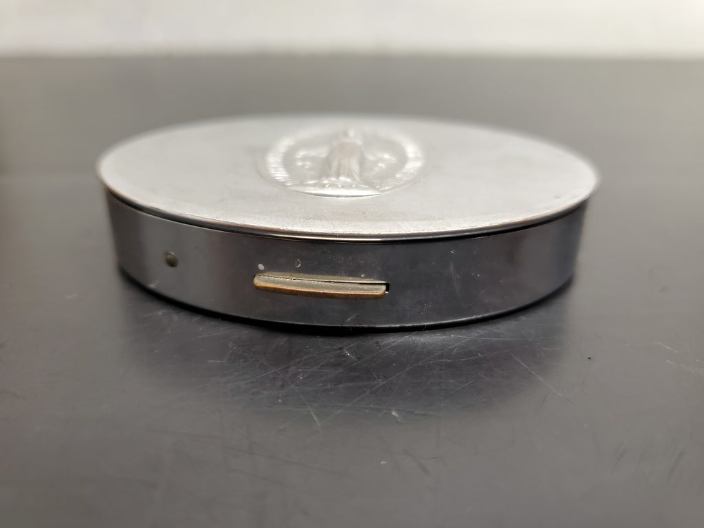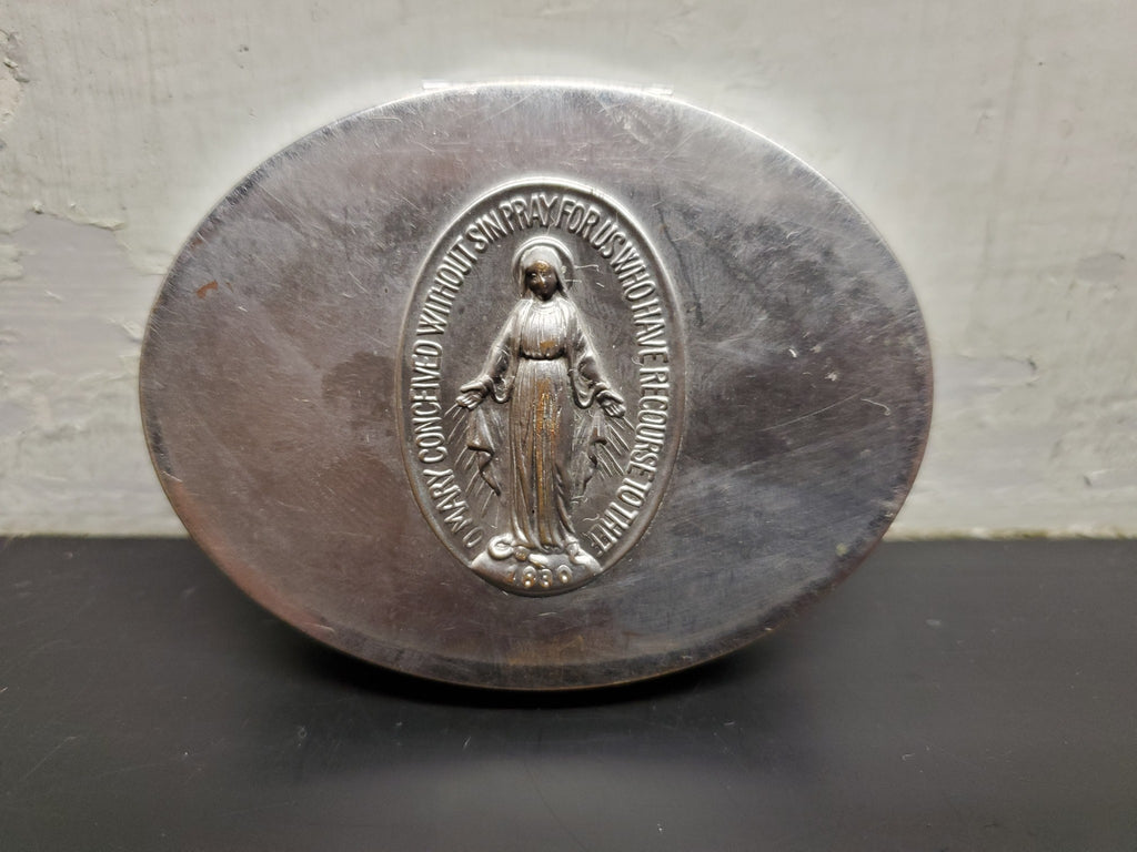 Vtg Antique Silver Trinket Jewelry Oval Box W/Prayer Mary Christianity Religion. Inscription on box reads the following: O Mary Conceived Without Sin Pray For Us Who Have Recourse To Thee.