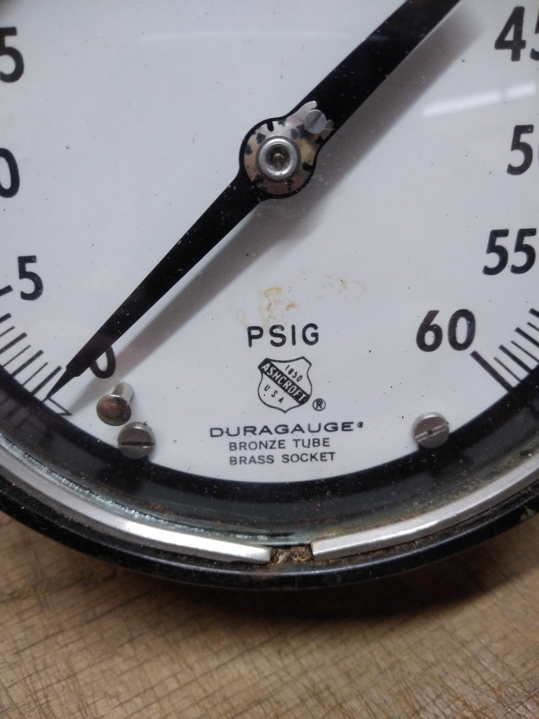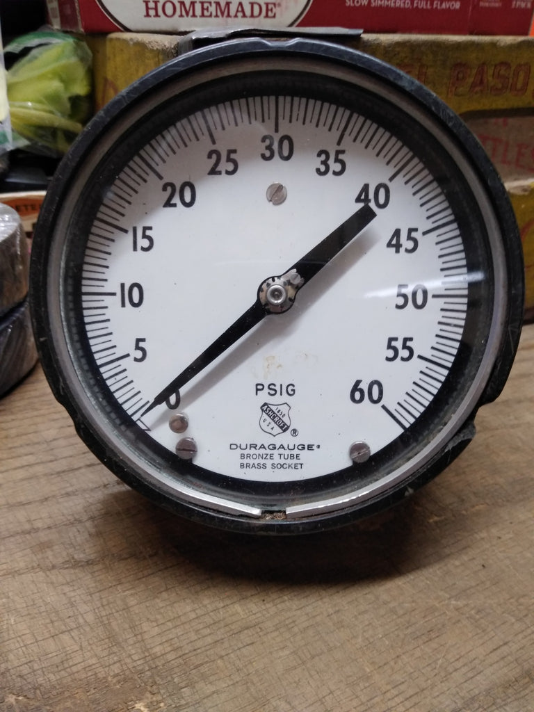 ***PLEASE LOOK AT ALL THE PICTURES AND ASK QUESTIONS BEFORE BUYING*** This is a Vintage Ashcroft Duragauge Bronze Tube Brass Socket 0-60 PSI Pressure Gauge 5 Inch Diameter Steampunk, Untested !!******Selling as pictured. The pictures are a substantial part of the description so please examine all the photos and contact me if you have any questions. We will be happy to save you shipping costs by picking this up at our shop. Thanks for looking. 021524- RK-03