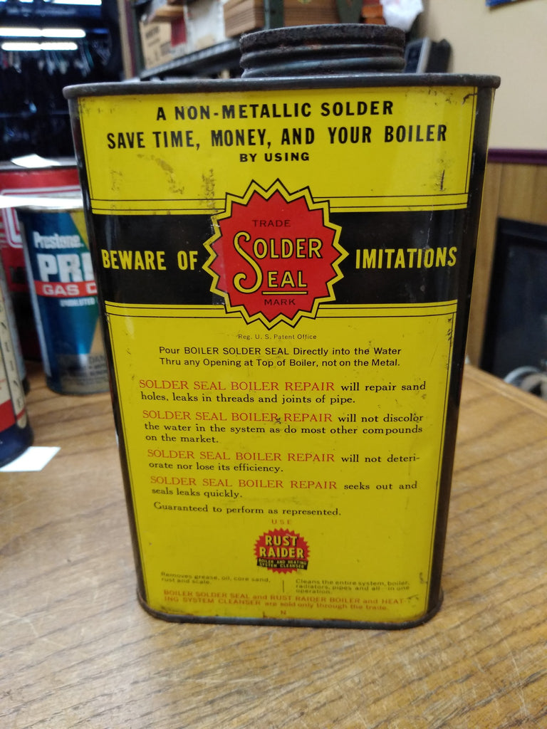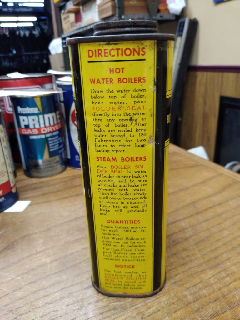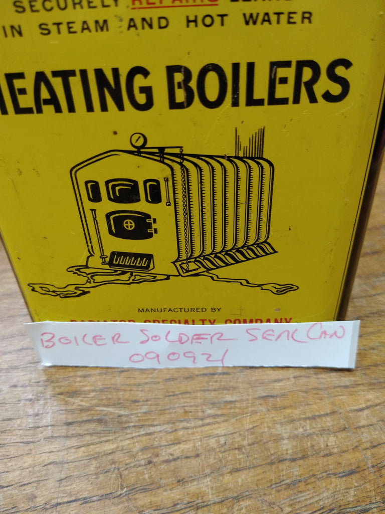 This is a Vintage Boiler Solder Seal Partially Full 1 1/4 pound can. This has really nice graphics and looks great! It does have shelf wear, scratches and needs cleaned. If cans are full we can empty it if you would like to save some money on shipping, just let us know. Be sure to read all condition descriptions. The pictures are a substantial part of the description so please examine all the photos and contact me if you have any questions. We will be happy to save you shipping costs by picking this up at our shop. Thanks for looking. 091021-RK-05