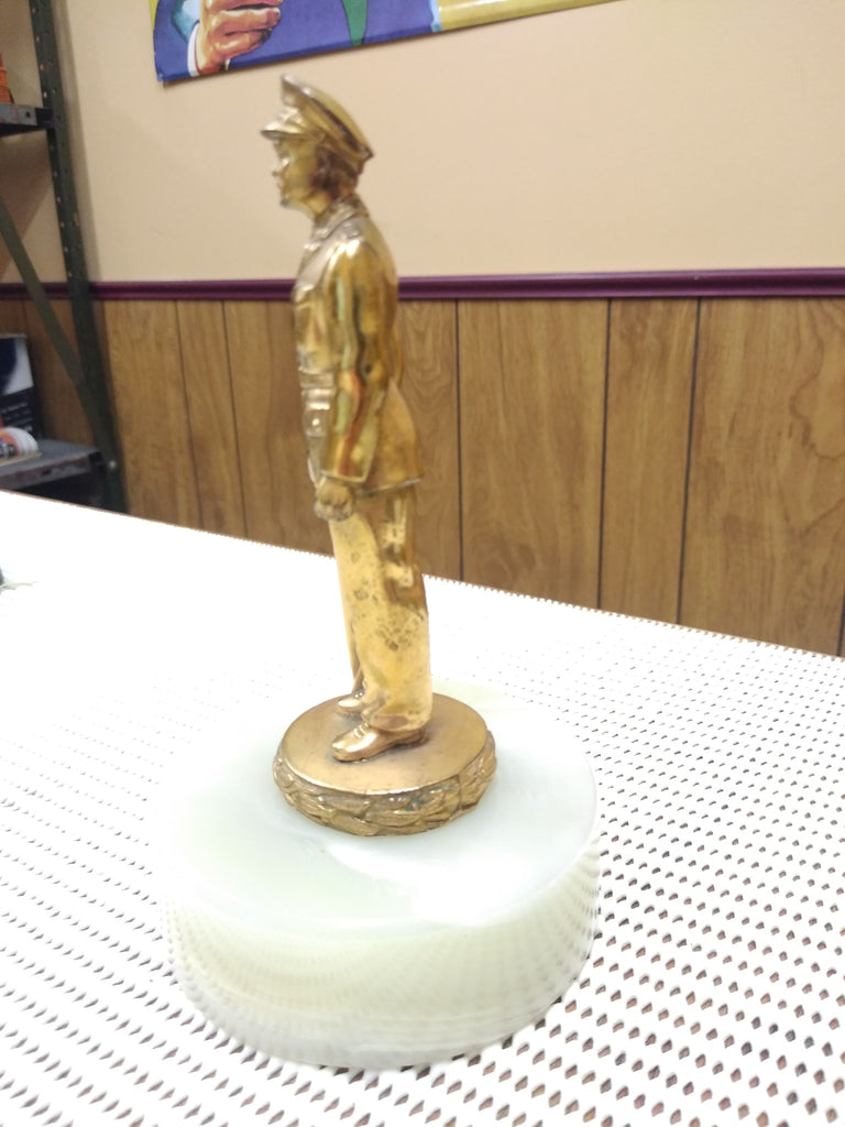This Estate Find is a Brass Soldier Sculpture on a Marble Base! This would make a nice paperweight or as a decorative piece, it is approximately 6 3/4" Tall. Please examine all the pictures and contact me if you have any questions. We will be happy to save you shipping costs by picking this up at our shop. Thanks for looking.