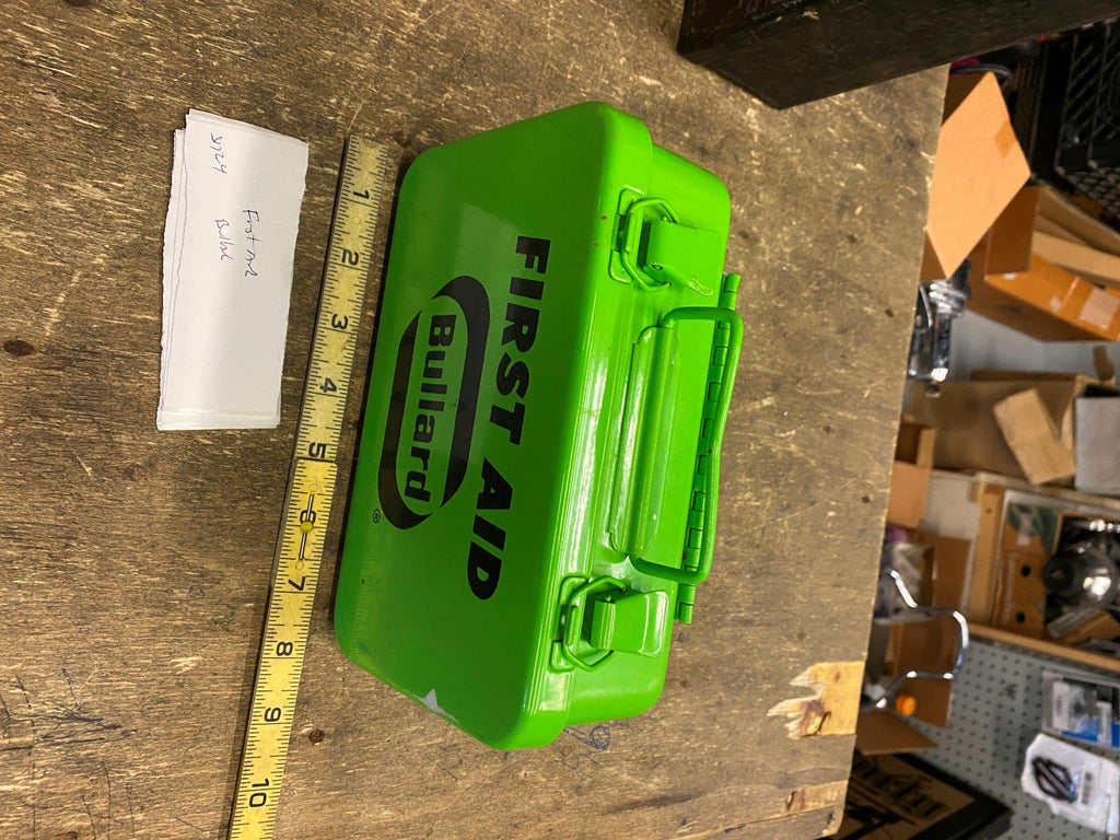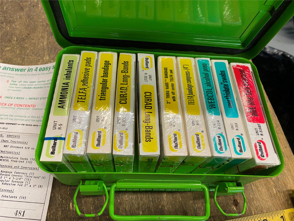 Vtg BULLARD FIRST AID KIT metal box OSHA Buss Commercial Bandages Ammonia Inhale looks all there, box looks like new, couple packages have seal off them..