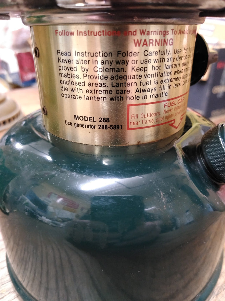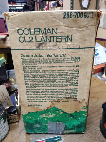 ***PLEASE LOOK AT ALL THE PICTURES AND ASK QUESTIONS BEFORE BUYING*** This is a Vintage Coleman Model #288 CL2 Adjustable 2 Mantle Portable Camp Lantern 1984 w/Box!. *** Selling as pictured as is. The pictures are a substantial part of the description so please examine all the photos and contact me if you have any questions. We will be happy to save you shipping costs by picking this up at our shop in Butler, Pa. Thanks for looking. 050724- RK-08