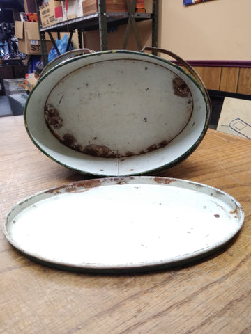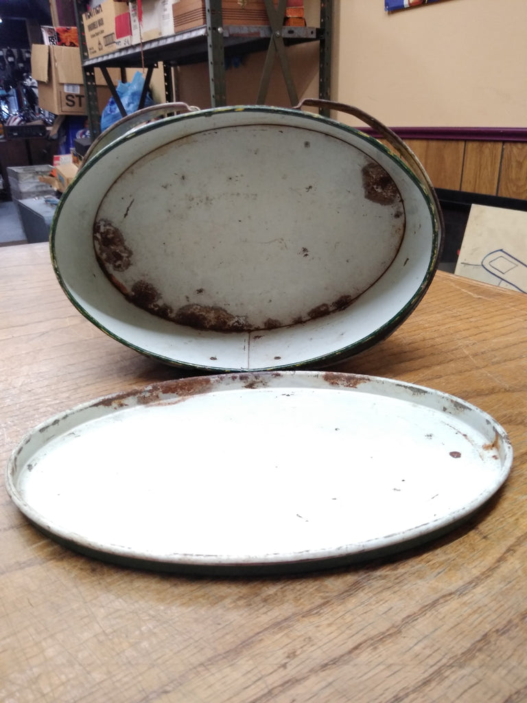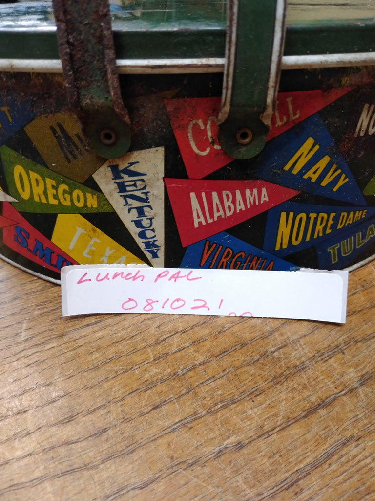 This Vtg Colleges and University Banners Tin Oval Lunch Pail Bucket with 2 Handles is a bit rusty but it is unique, the rust will clean up somewhat! Be sure to read all condition descriptions. The pictures are a substantial part of the description so please examine all the photos and contact me if you have any questions. We will be happy to save you shipping costs by picking this up at our shop. Thanks for looking.
