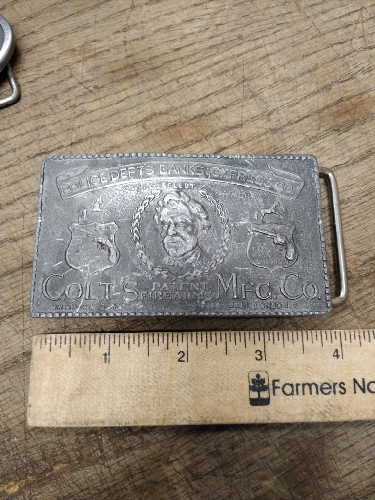 ***PLEASE LOOK AT ALL THE PICTURES AND ASK QUESTIONS BEFORE BUYING*** This is a Vintage Colt's MFG Co Patent Firearms 4" x 2" Belt Buckle USA Pall Mall London. The pictures are a substantial part of the description so please examine all the photos and contact me if you have any questions. We will be happy to save you shipping costs by picking this up at our shop. Thank You 082924- RK-03