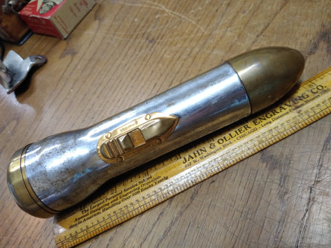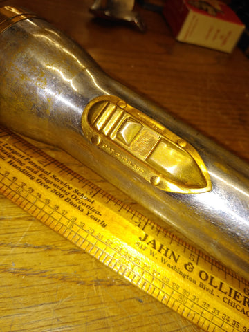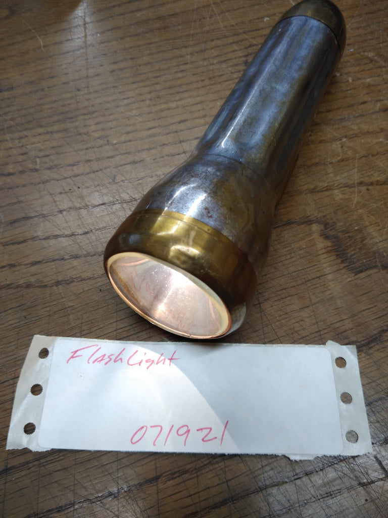 This is a Vintage D Cell Flashlight, it has thick beveled glass and is Made In the USA! It does light up if you put batteries into it but I couldn't get the switch to work, maybe just a simple adjustment. The flashlight does show wear and signs of use. Batteries not included. Please examine all the pictures and contact me if you have any questions. We will be happy to save you shipping costs by picking this up at our shop. Thanks for looking. 071921