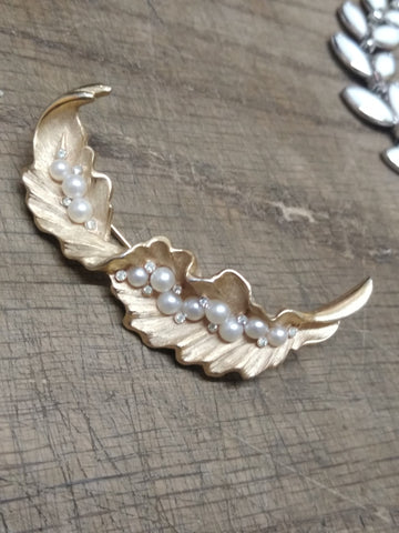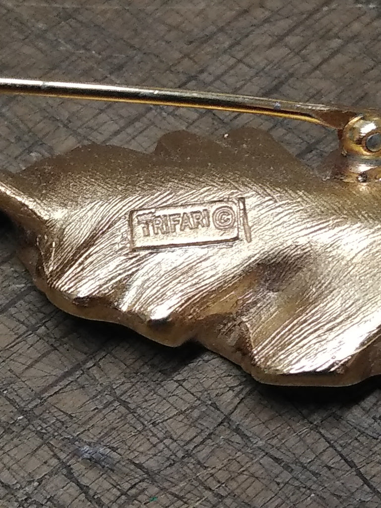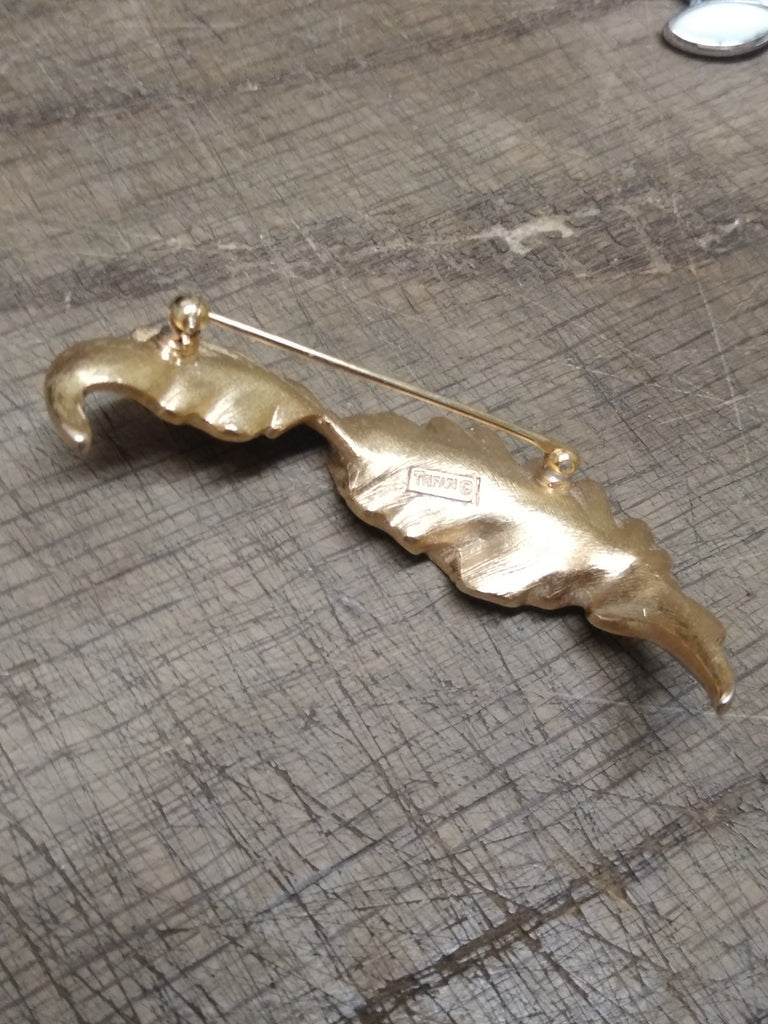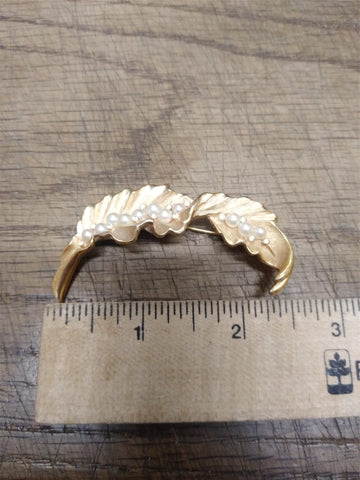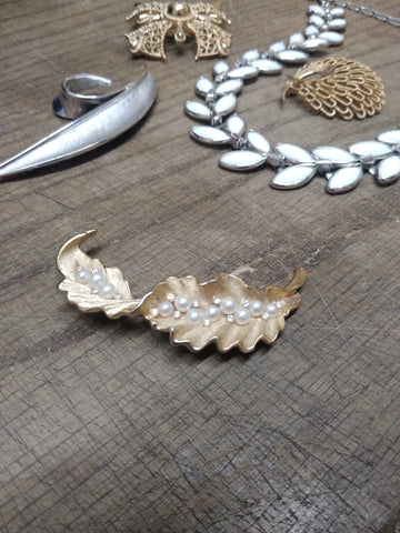 ***PLEASE LOOK AT ALL THE PICTURES AND ASK QUESTIONS BEFORE BUYING*** This is a Vintage Designer Signed Crown Trifari Crystal Faux Pearl Gold Tone Leaf Brooch 2.5 Inches, Very Nice !!!