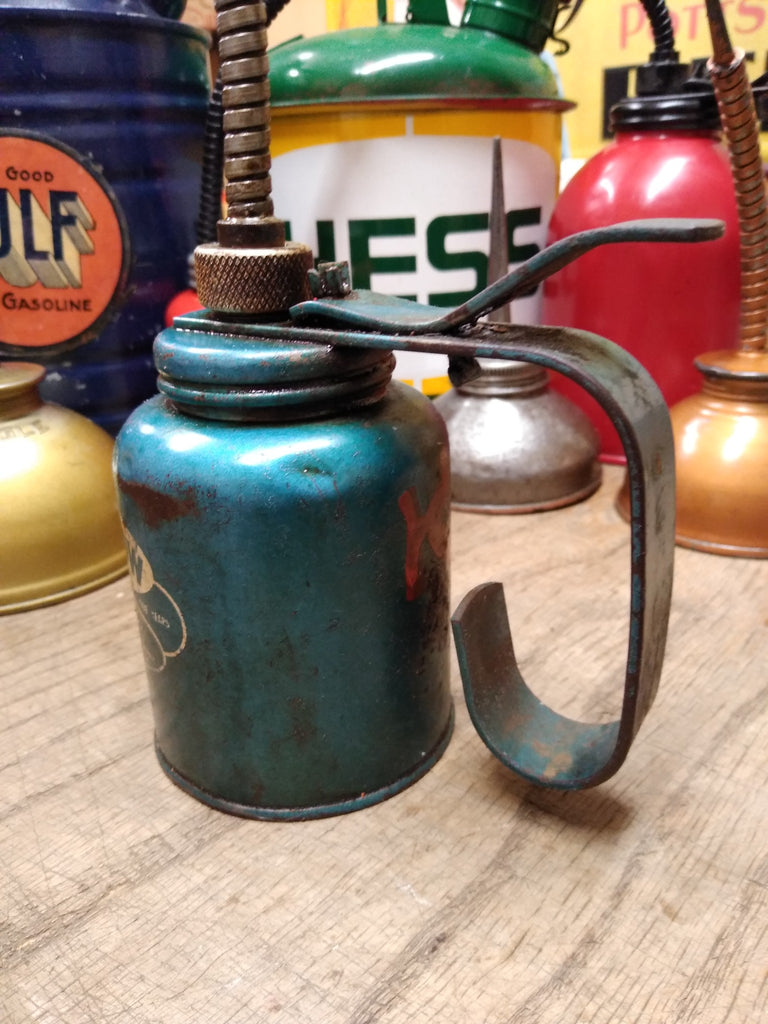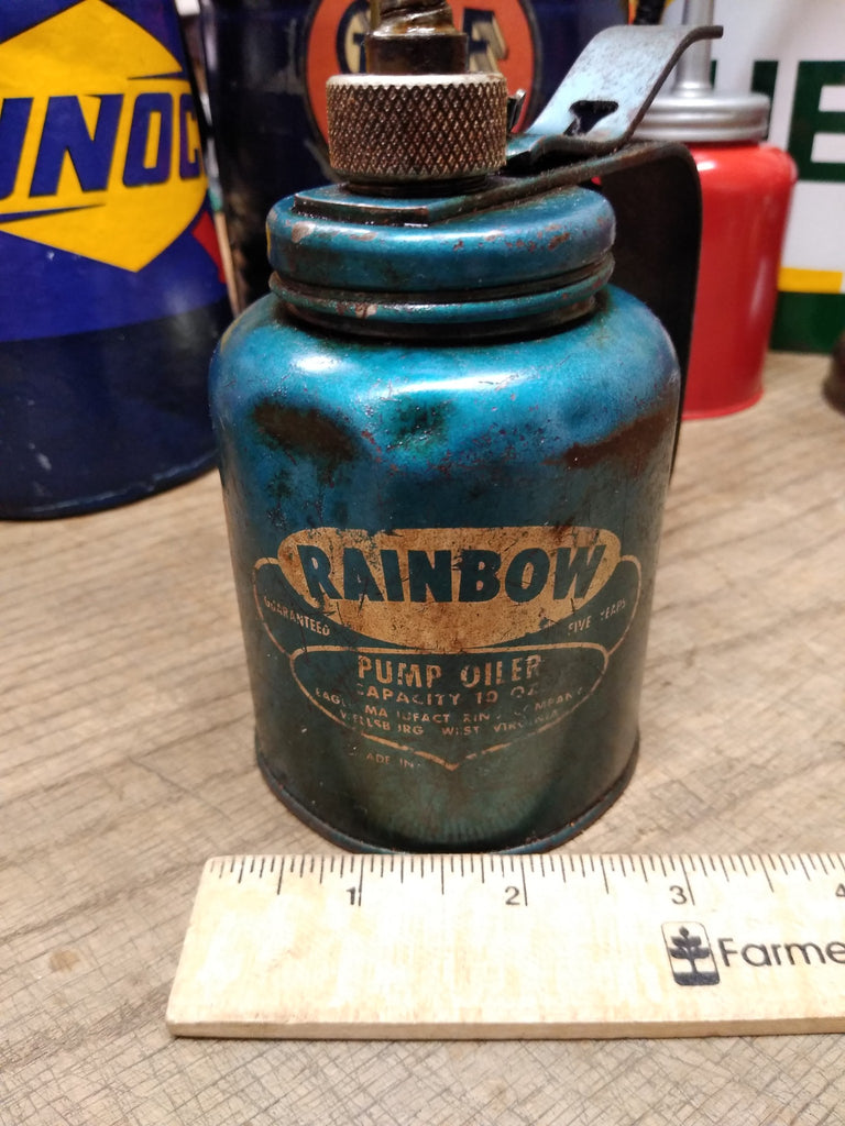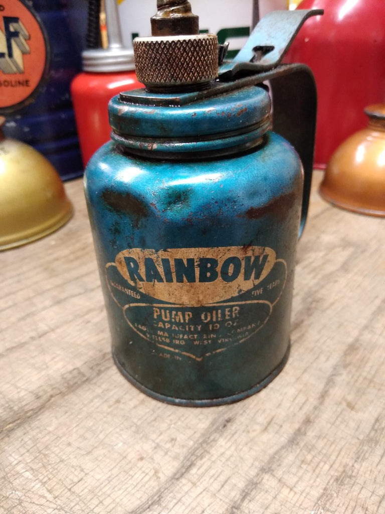 This is a Vintage Eagle Rainbow 10 Ounce Blue Squeeze Pump Oiler Working!. ****** The pictures are a substantial part of the description so please examine all the photos and contact me if you have any questions. We will be happy to save you shipping costs by picking this up at our shop. Thanks for looking. 010924- RK-01
