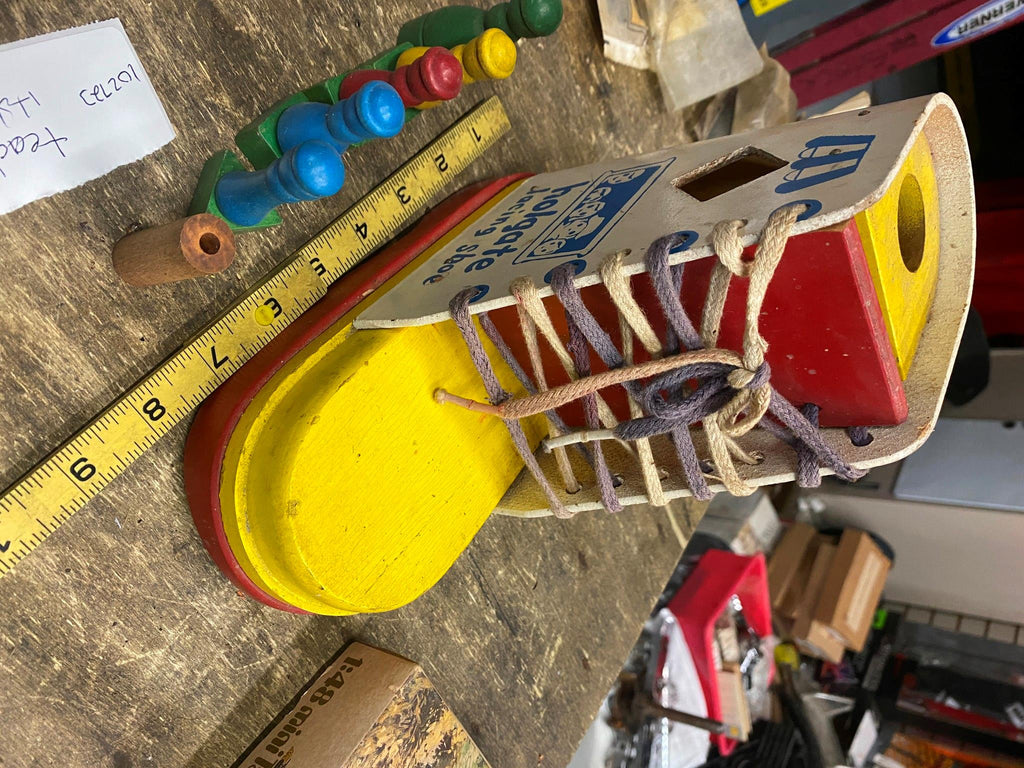 Vtg Educational Toy Shoe Boot teach kids how to lace Square Triangle Blocks Holgate lacing toy..... guessing 1960's   great for the grandkids!!
