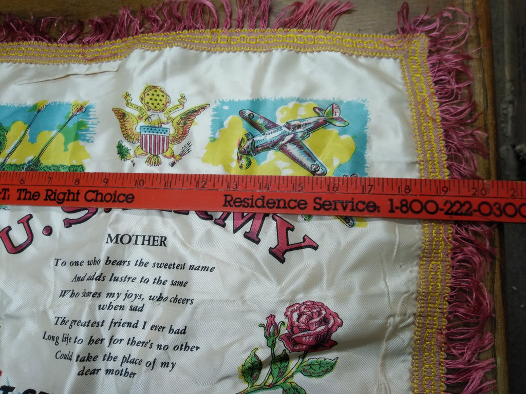 ***PLEASE LOOK AT ALL THE PICTURES AND ASK QUESTIONS BEFORE BIDDING*** This is a Vintage Fort George G Meade MD U S Army WWII Military Satin Pillow Cover Sham for Mother.  *** The pictures are a substantial part of the description so please examine all the photos and contact me if you have any questions. We will be happy to save you shipping costs by picking this up at our shop. Thank You  030425- RK-02