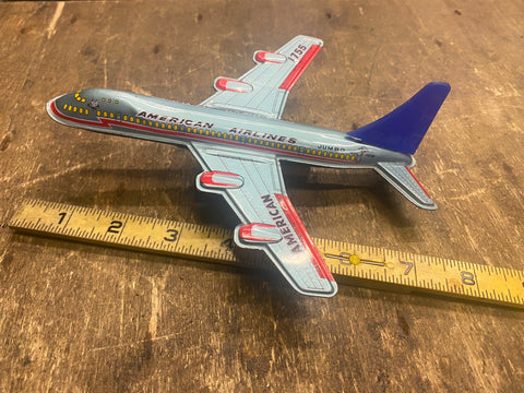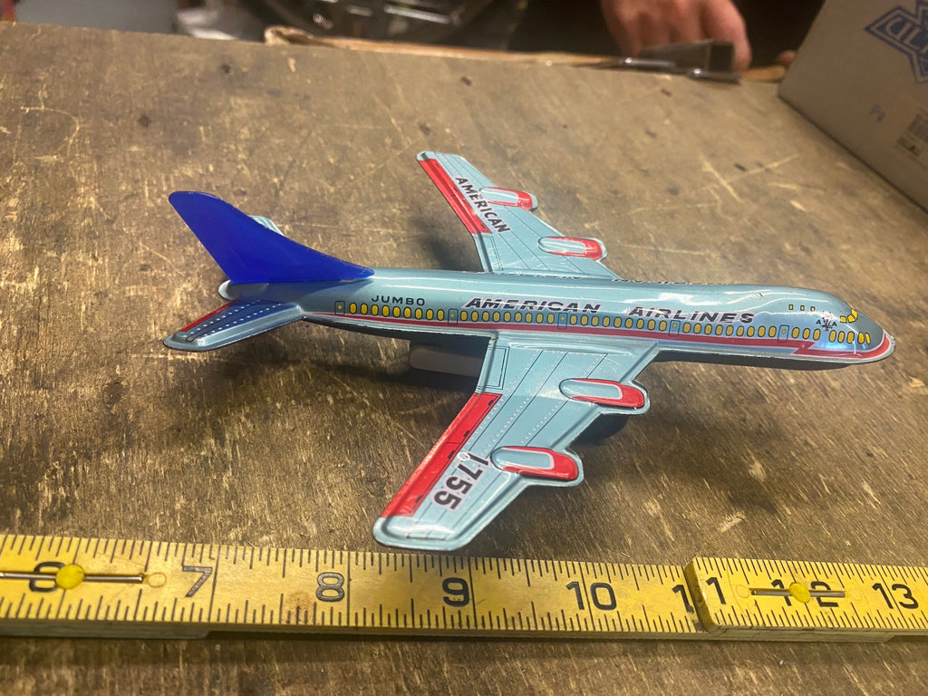 Vtg Friction airplane Marusyo Tin toy Lot Japan 1960's Boeing 727 AA american airlines... matching set!! pretty nice shape, friction needs work. rust spot on bottom.... selling the pair as pictured