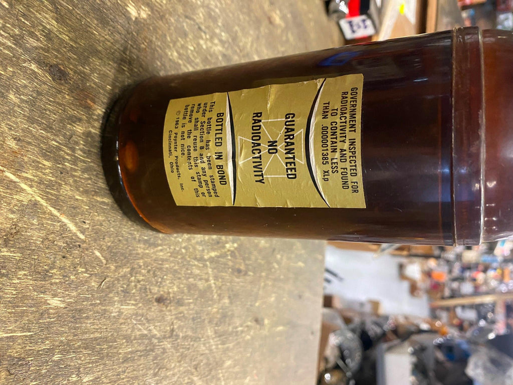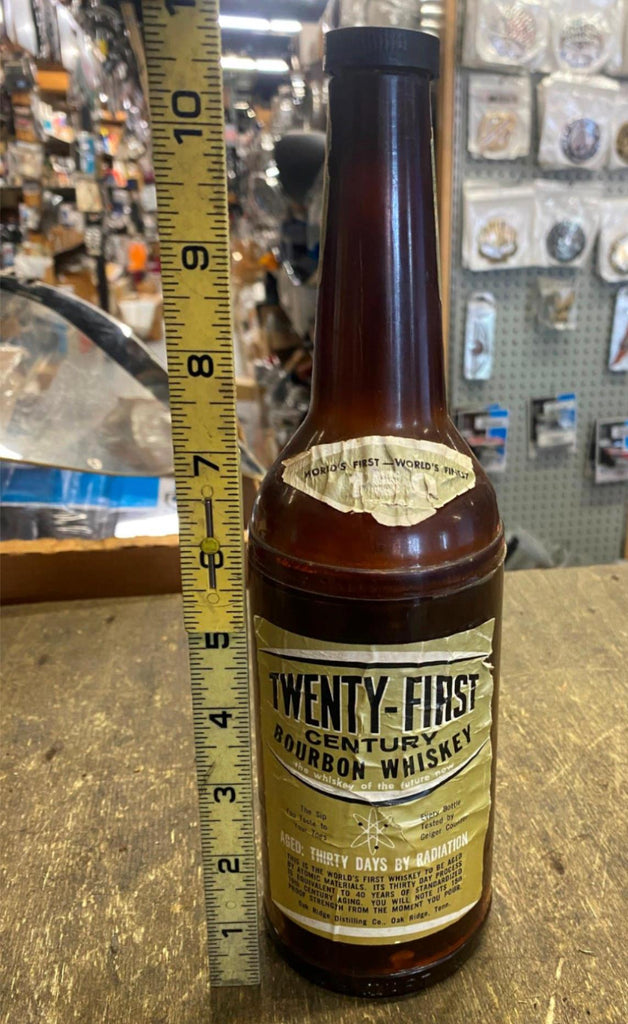 According to the label on the front of the bottle, it was "produced by the fictitious Oak Ridge Distilling Company, aged by radiation and tested with a Geiger Counter."