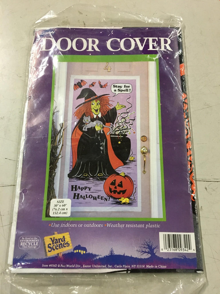Vtg Fun World Halloween Door Cover Witch "Stay for a Spell" w Pumpkin Bats cat. This item is new. It does have a few holes in the plastic packaging. I have not seen any other ones of these that have a purple cover like this one.