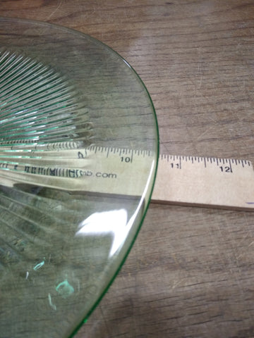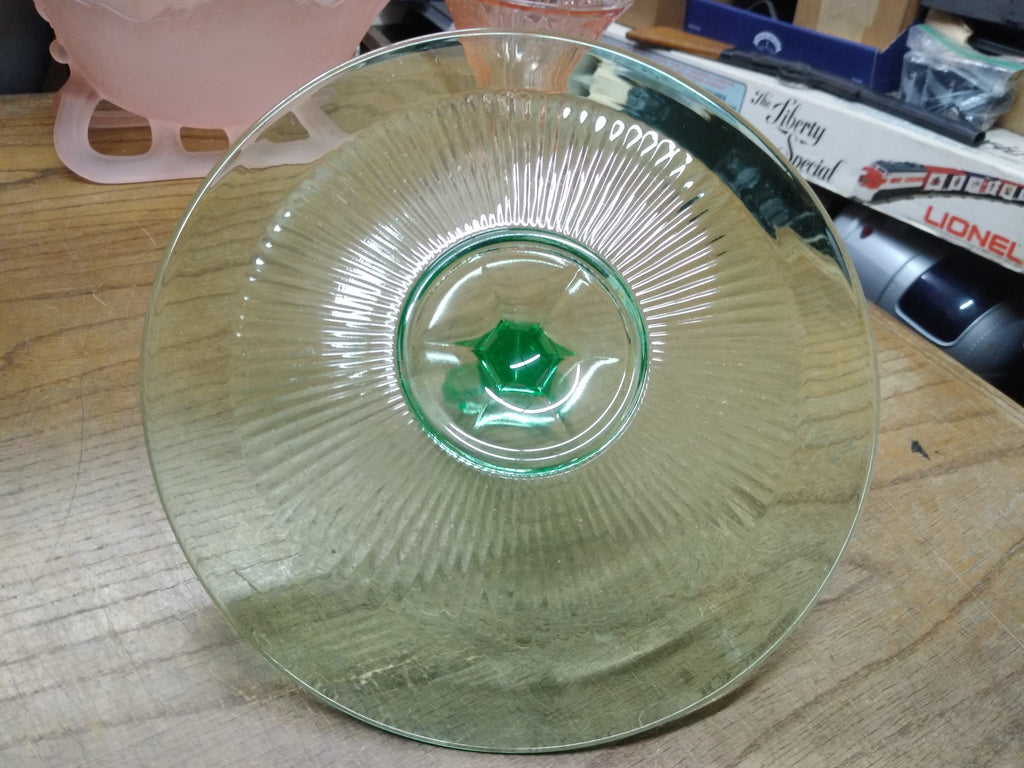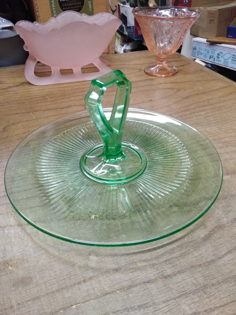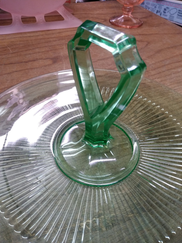 This is a Vtg. Green Depression Glass Veggie Fruit Desert Dish w/Center Handle 5"H x 10.5"W in Very Nice Condition with no chips or cracks. The pictures are a substantial part of the description so please examine all the photos and contact me if you have any questions. We will be happy to save you shipping costs by picking this up at our shop. Thanks for looking. 042723-07-RK