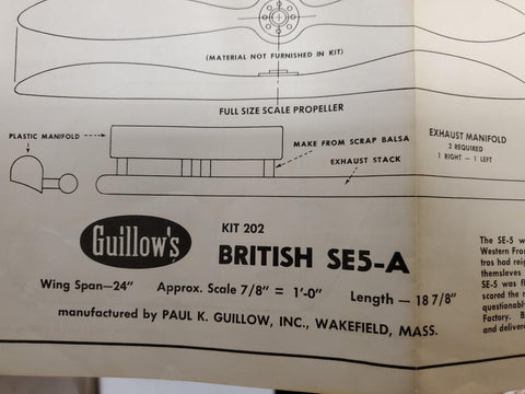 VTG GUILLOWS KIT 202 FLYING MODEL KIT BRITISH S.E.5A WW1 FIGHTER 24"WIING SPAN