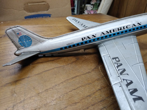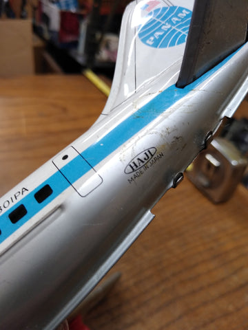 This is a Really Cool Vintage 1960's HAJI Pan American Tin Toy Clipper Jet Working Friction Motor Airplane made in Japan! The pictures are a substantial part of the description so please examine all the photos and contact me if you have any questions. We will be happy to save you shipping costs by picking this up at our shop. Thanks for looking. 032222- RK-06