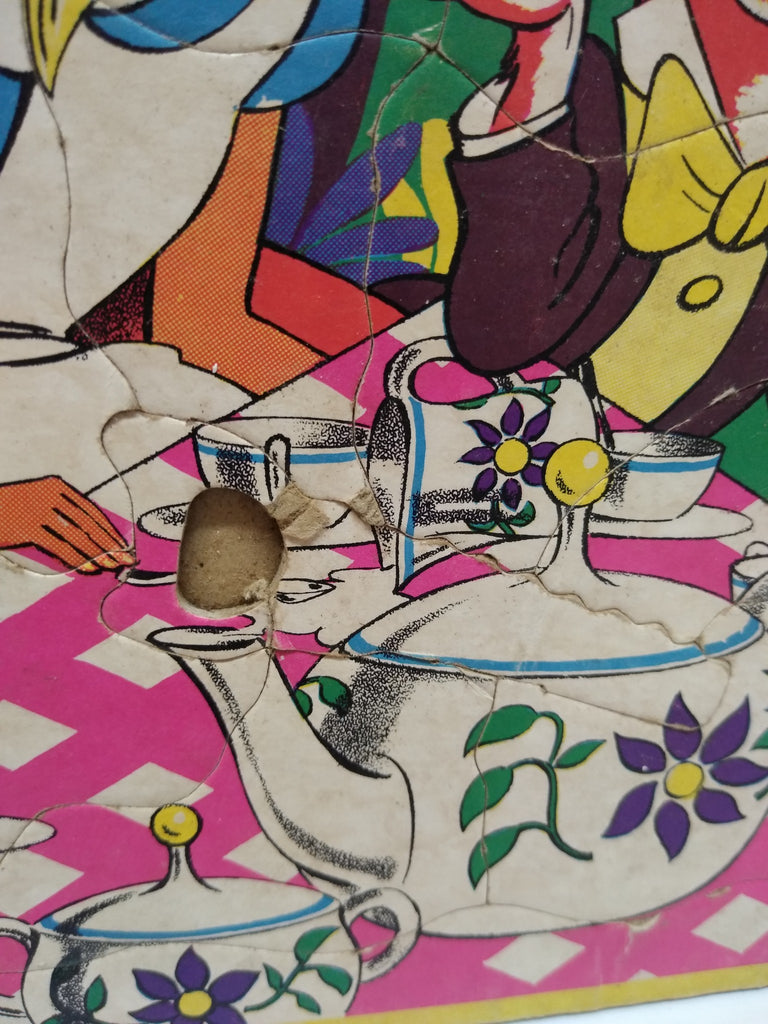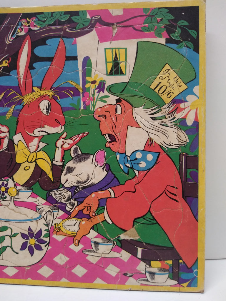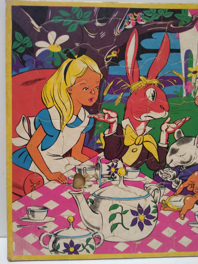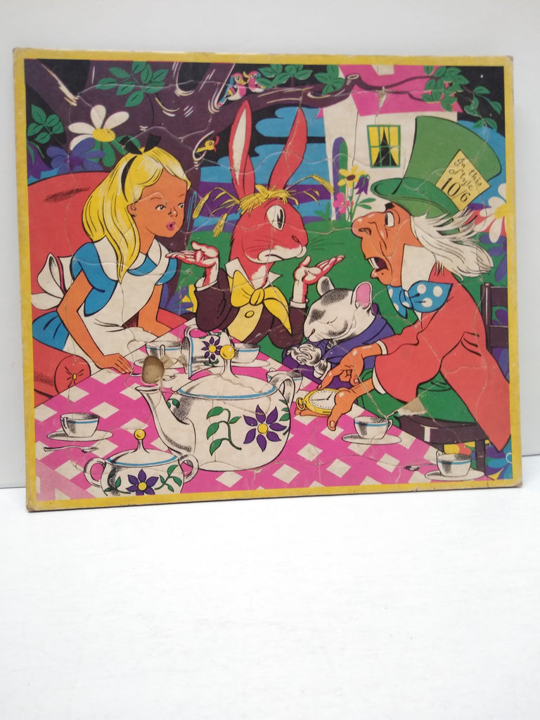 This Estate Find is a Vintage Alice in Wonderland Jigsaw Framed Picture Puzzle Picture Puzzle. I do not know who the publisher of this puzzle is. It has a missing piece and missing paper finish, shows wear, loose edges and needs cleaned. Please examine all the pictures and contact me if you have any questions. We will be happy to save you shipping costs by picking this up at our shop. Thanks for looking.