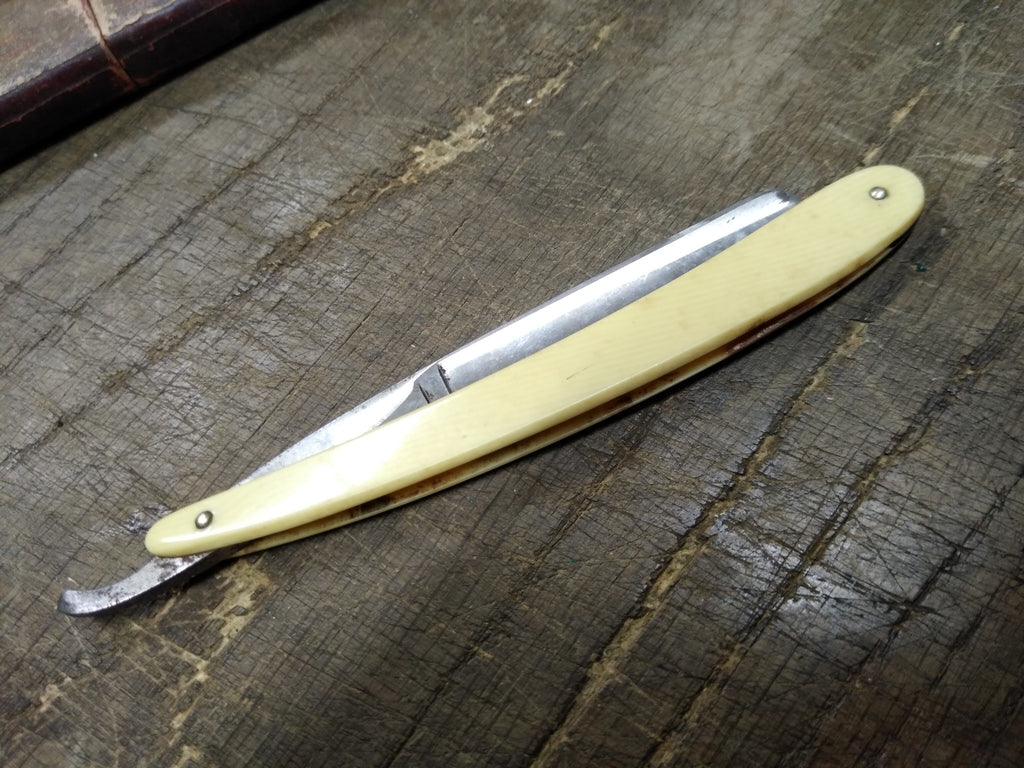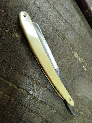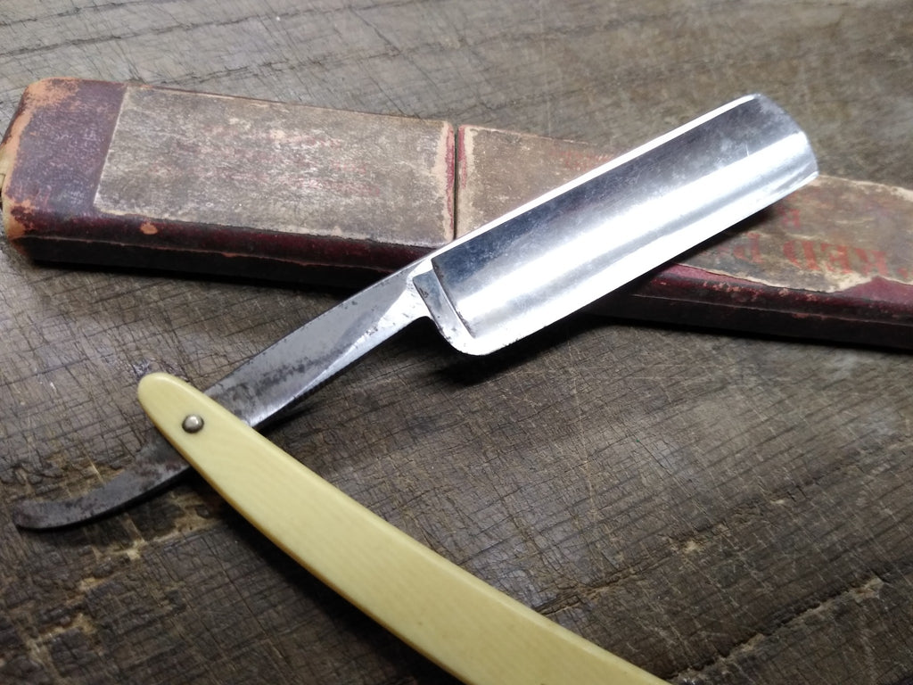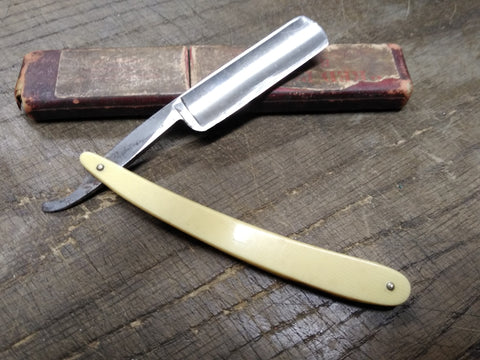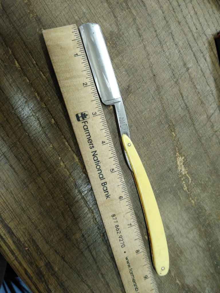 ***PLEASE LOOK AT ALL THE PICTURES AND ASK QUESTIONS BEFORE BIDDING*** Vintage Kut Ezy Straight Razor with Jimps Nice Scales w/Red Point Box Nice Shape!