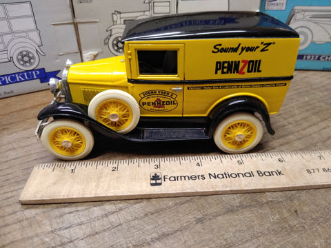 This is a Vintage Liberty Classics Ford Model A Pennzoil Coin Bank Delivery Van Die Cast Metal Nice Shape!  *** Selling as pictured as is. The pictures are a substantial part of the description so please examine all the photos and contact me if you have any questions. We will be happy to save you shipping costs by picking this up at our shop in Butler, Pa. Thanks for looking.  052824- RK-07