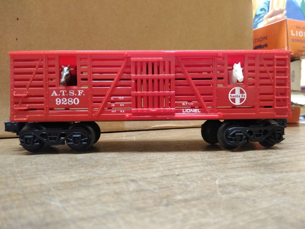 This is a Vtg Lionel A.T.S.F Santa Fe O Gauge #9280 Livestock Two-Horse Transport Car! The pictures are a substantial part of the description so please examine all the photos and contact me if you have any questions. We will be happy to save you shipping costs by picking this up at our shop. Thanks for looking. 091622-4-RK