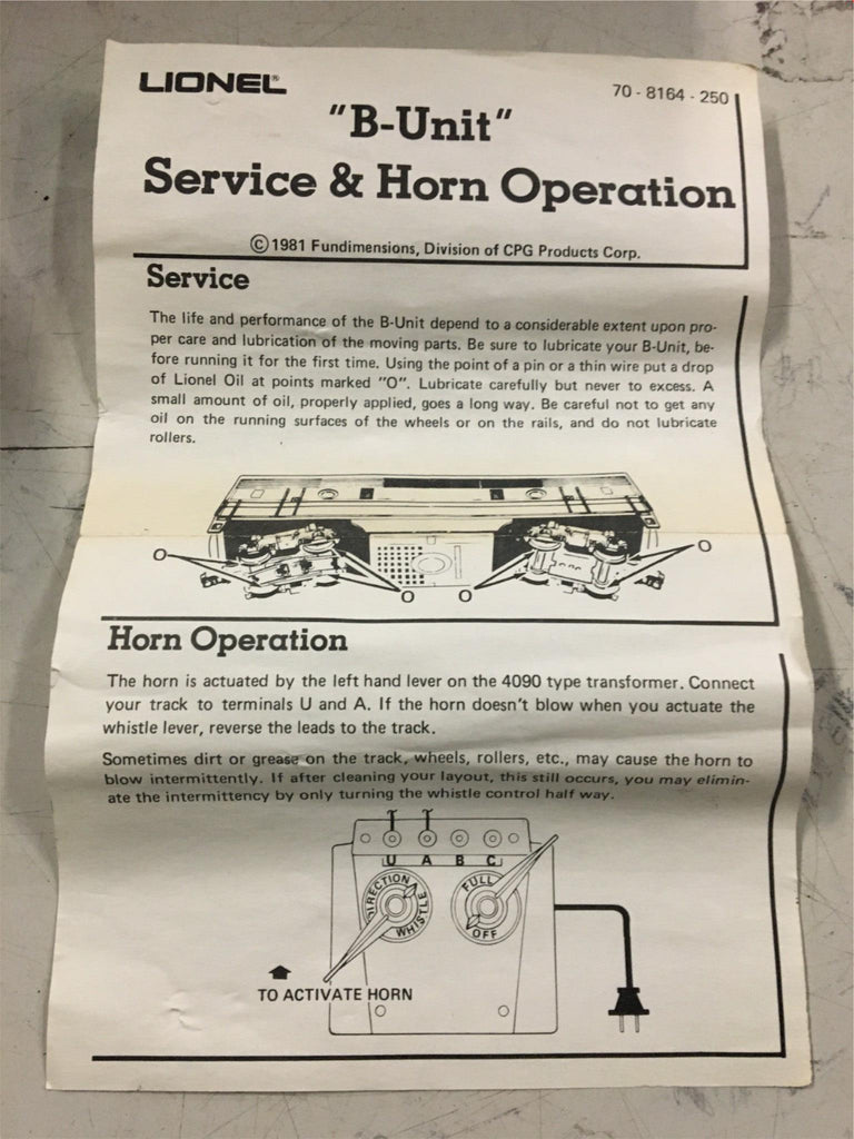 This item DOES NOT come with the 4090 type transformer that is necessary for the horn to work. I had some one message me with this, "item is missing the pickup collector rollers from the bottom of the wheel trucks. This means that the electronic horn will not work. It appears thaws have been removed." Not sure if that's correct, but couldn't hurt to know more.