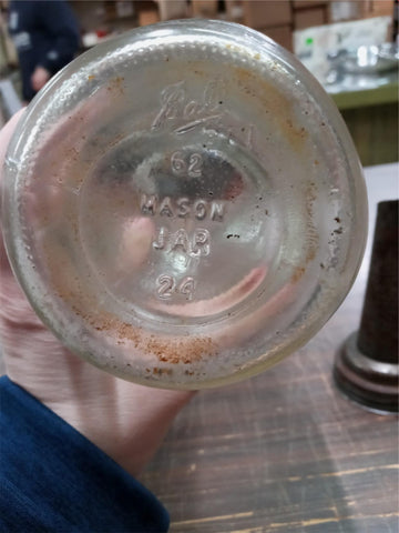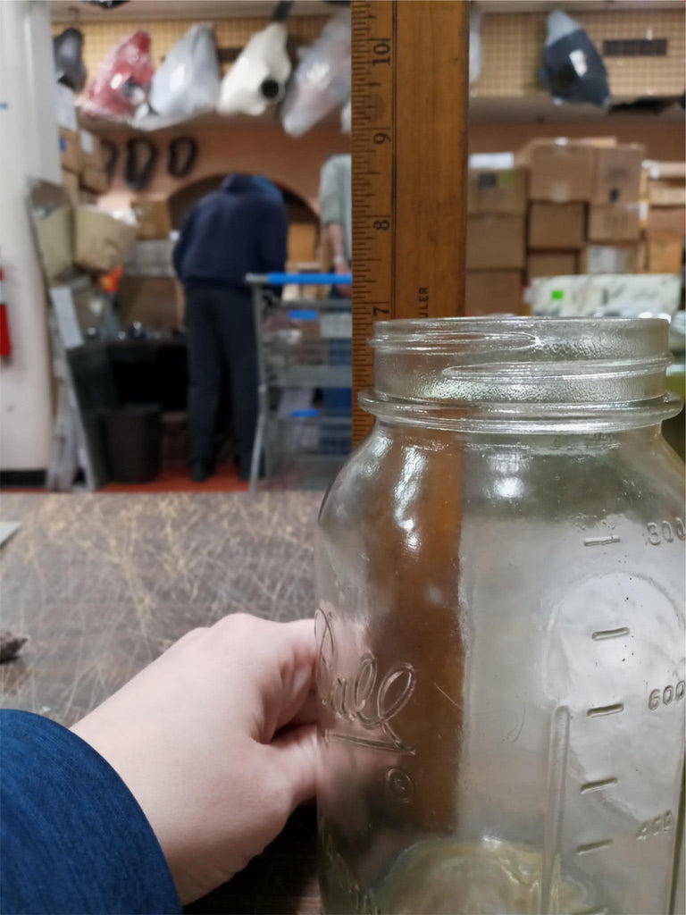 Motor oil dispenser glass bottle with metal spout made by master mfg. co. the embossed spout does not have a cork seal