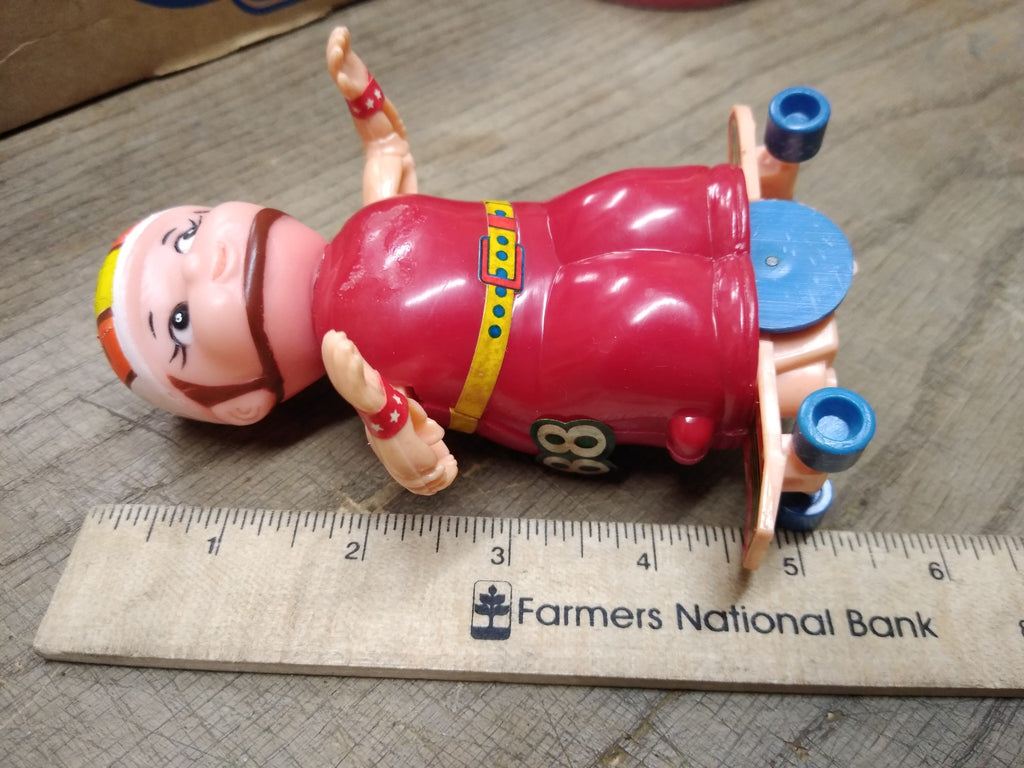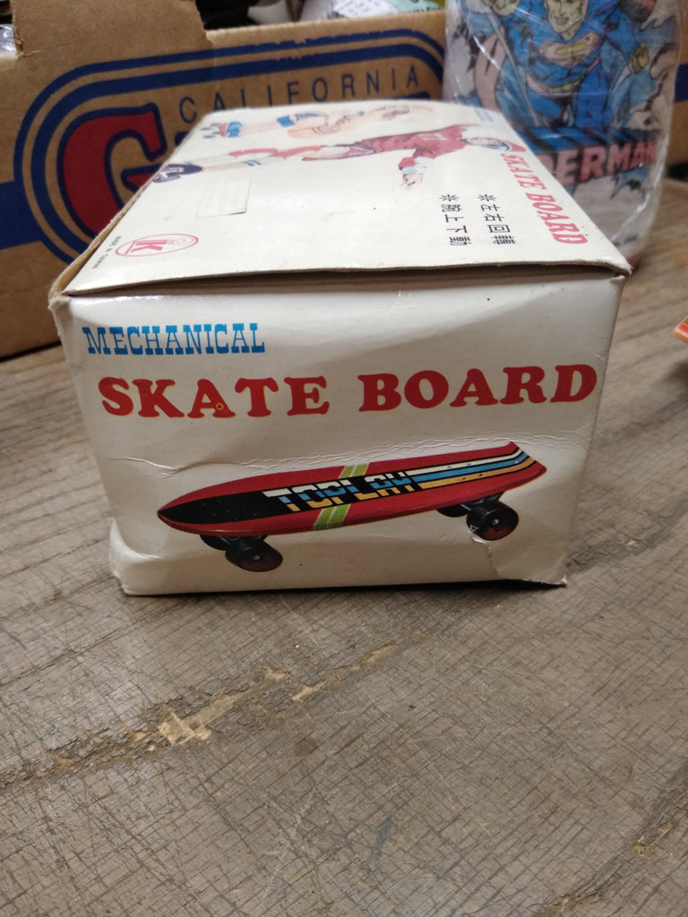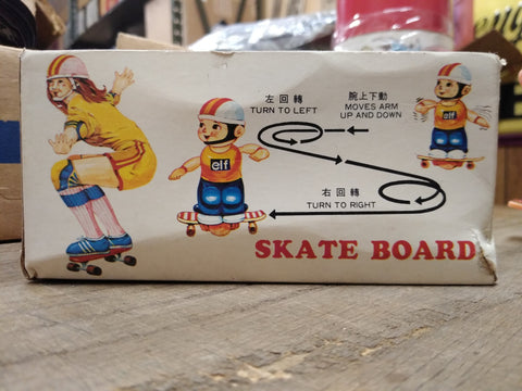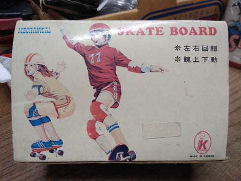 This is a Vintage LK Mechanical Wind Up Skate Board Rider In Original Box, (missing winding key but winds with plyers) Works Great and in Great Shape!  ***Selling as pictured. The pictures are a substantial part of the description so please examine all the photos and contact me if you have any questions. We will be happy to save you shipping costs by picking this up at our shop. Thanks for looking.  022724- RK-04