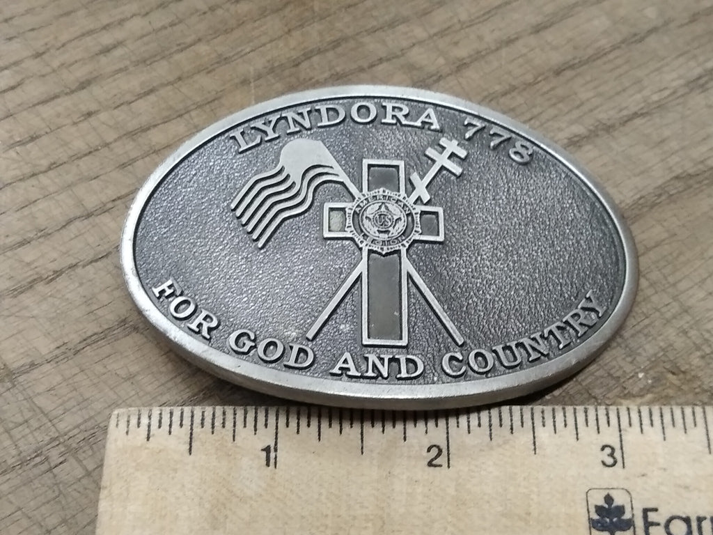 ***PLEASE LOOK AT ALL THE PICTURES AND ASK QUESTIONS BEFORE BIDDING*** This is a Vintage Lyndora Pa 778 American Legion Belt Buckle For God And Country in Good Shape . ****** The pictures are a substantial part of the description so please examine all the photos and contact me if you have any questions. We will be happy to save you shipping costs by picking this up at our shop. Thanks for looking. 122923- RK-10