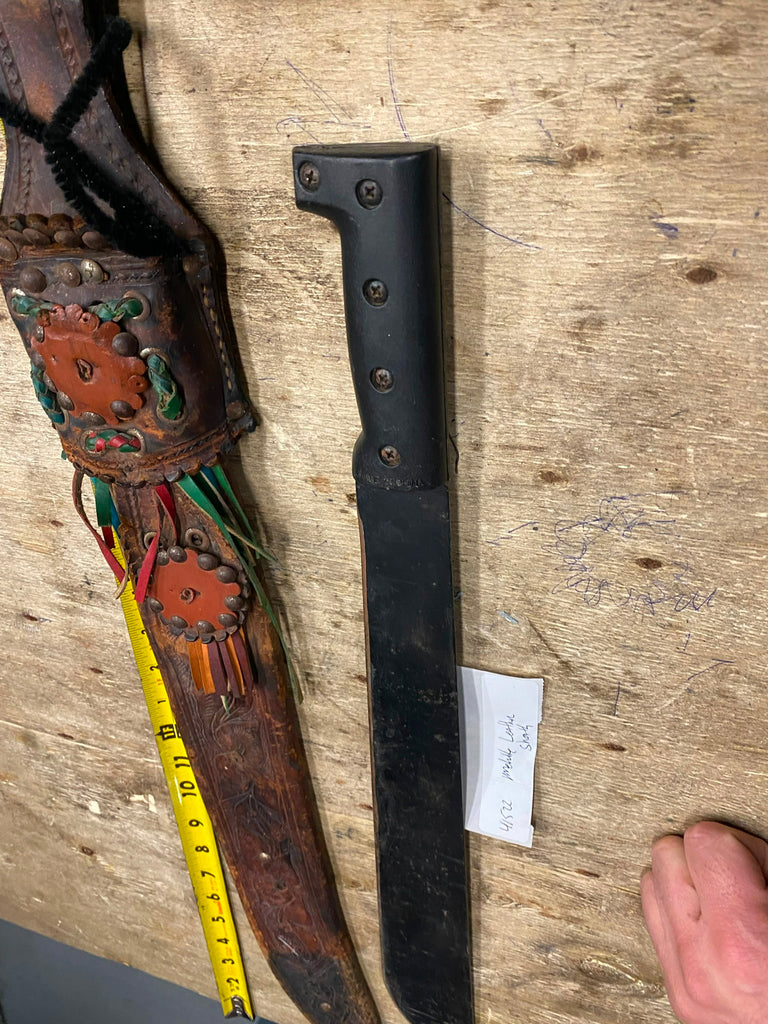 Vtg Machette Hand Tooled Sewn Sheath Leather Fancy Knife WW2 Okinawa Marines guy said it was his uncles who was stationed in okinawa during ww2....the machette is later chinese, he said he used the machette for cutting down weeds & playing army when he was a kid & destroyed it but the sheath was indoors..... put a cheap one in it for sizes etc.....