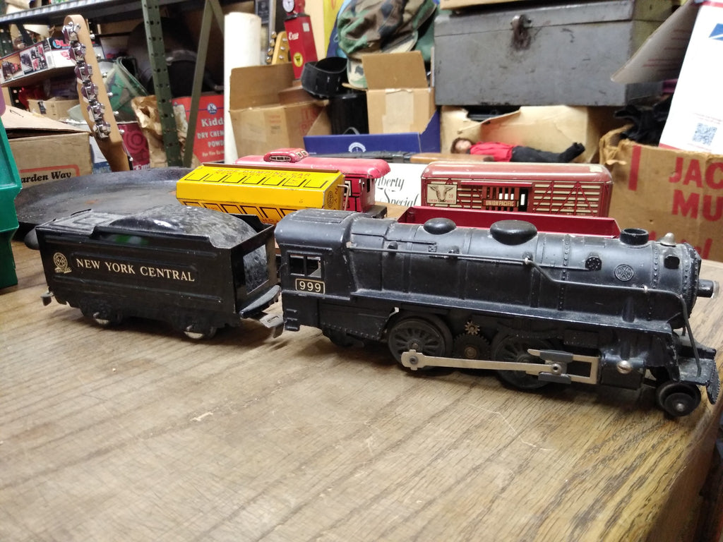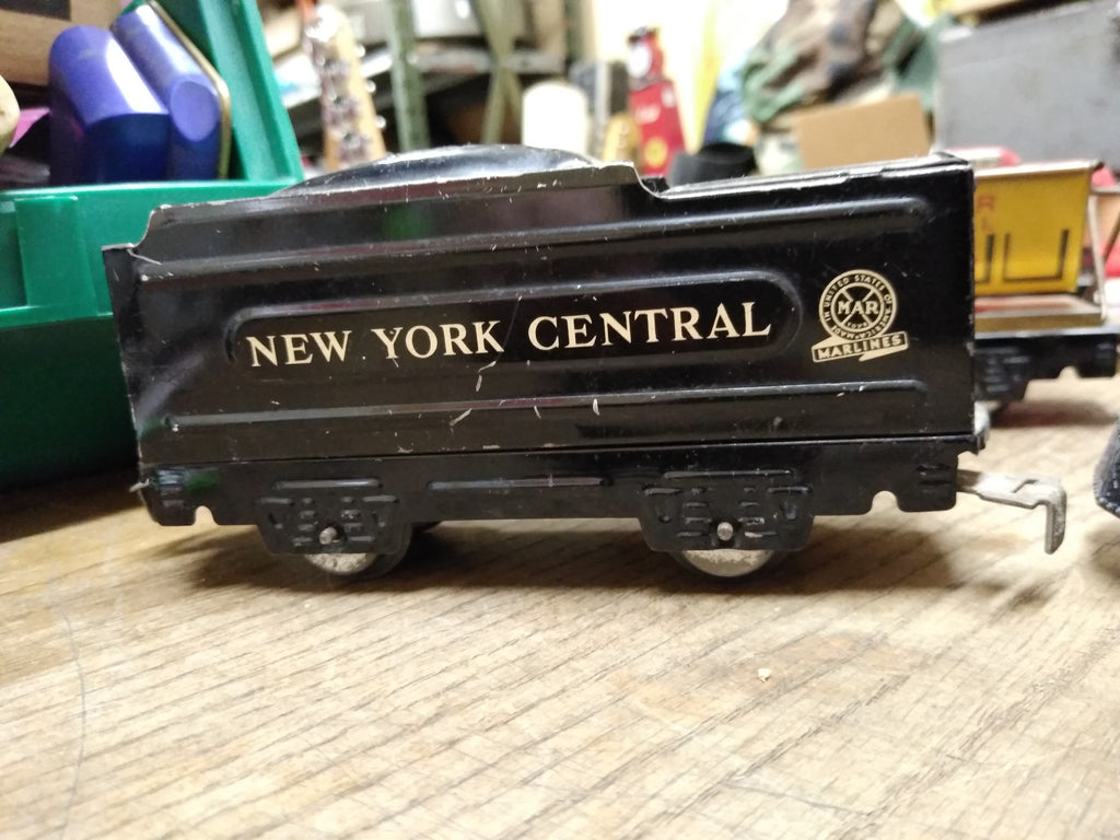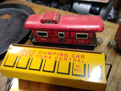 This is a Vintage Marx Marlines O Gauge Train Set New York Central #999 Locomotive (Wheels Turn Freely) & Tender, #567 Side Dumping Car, Union Pacific #59 Cattle Car, NYC #556 Caboose, Rock Island #552 Gondola, all in Good Shape!