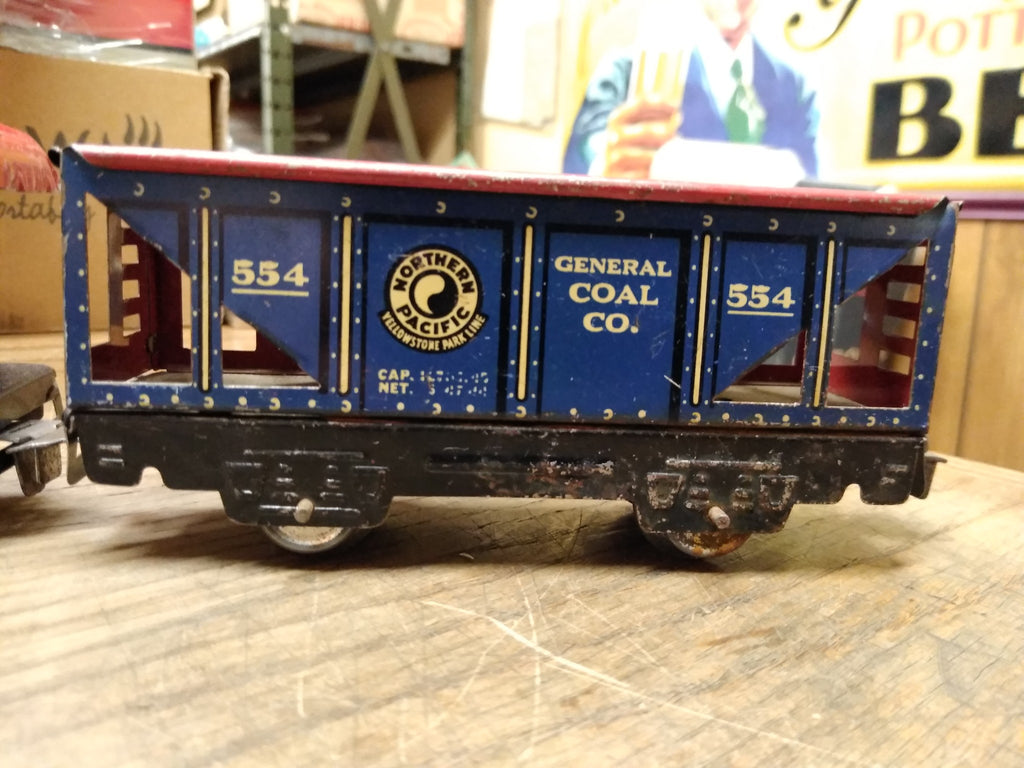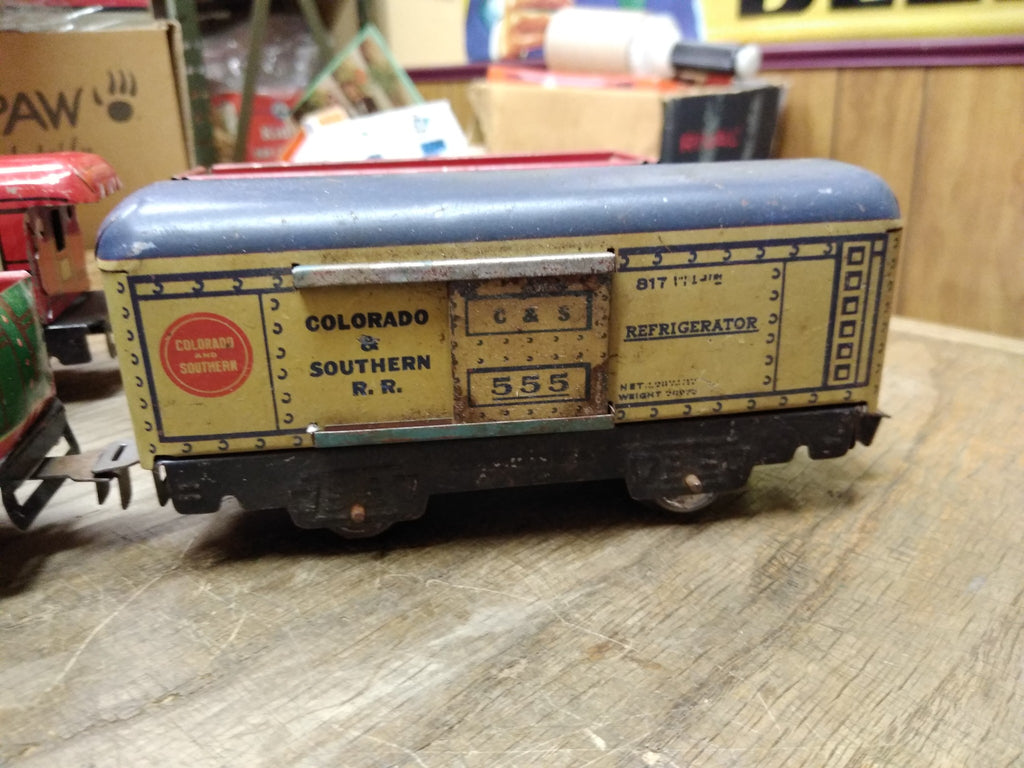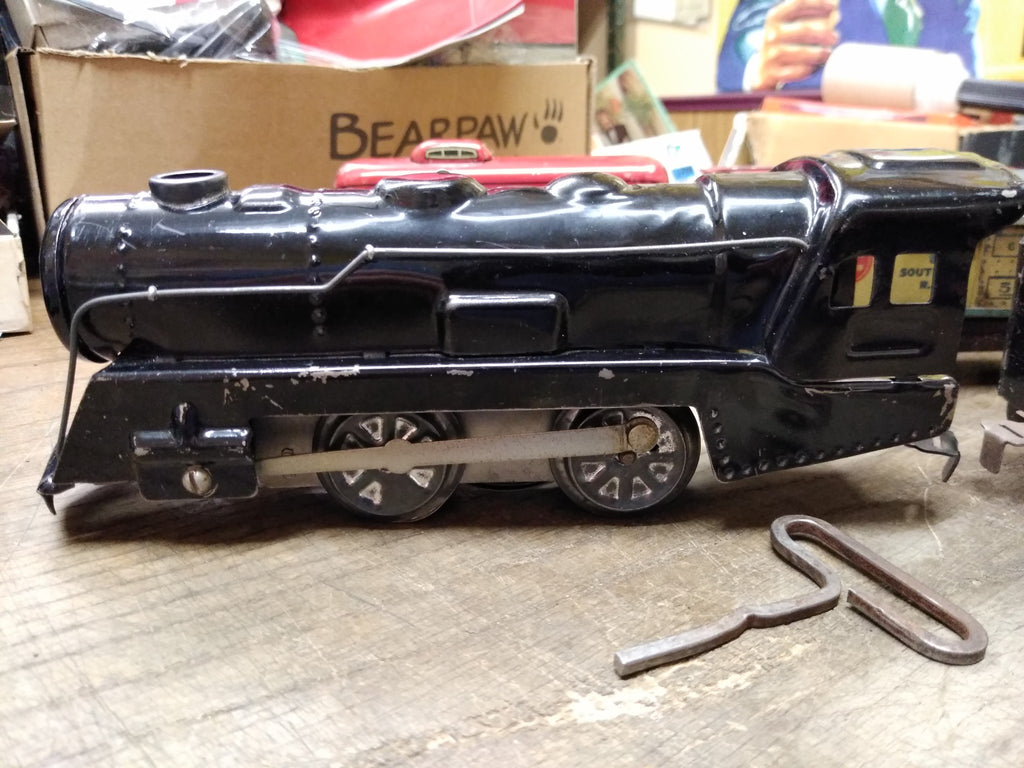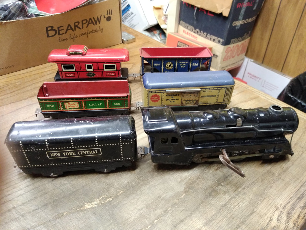 ***PLEASE LOOK AT ALL THE PICTURES AND ASK QUESTIONS BEFORE BIDDING*** Vintage MARX Tin Locomotive Train, Wind Up Motor, 5 Cars, Tender, Gondola Car, Reefer, Coal Car, and Caboose, with a Strong Working Motor and Bell!