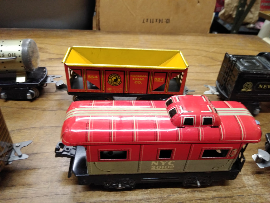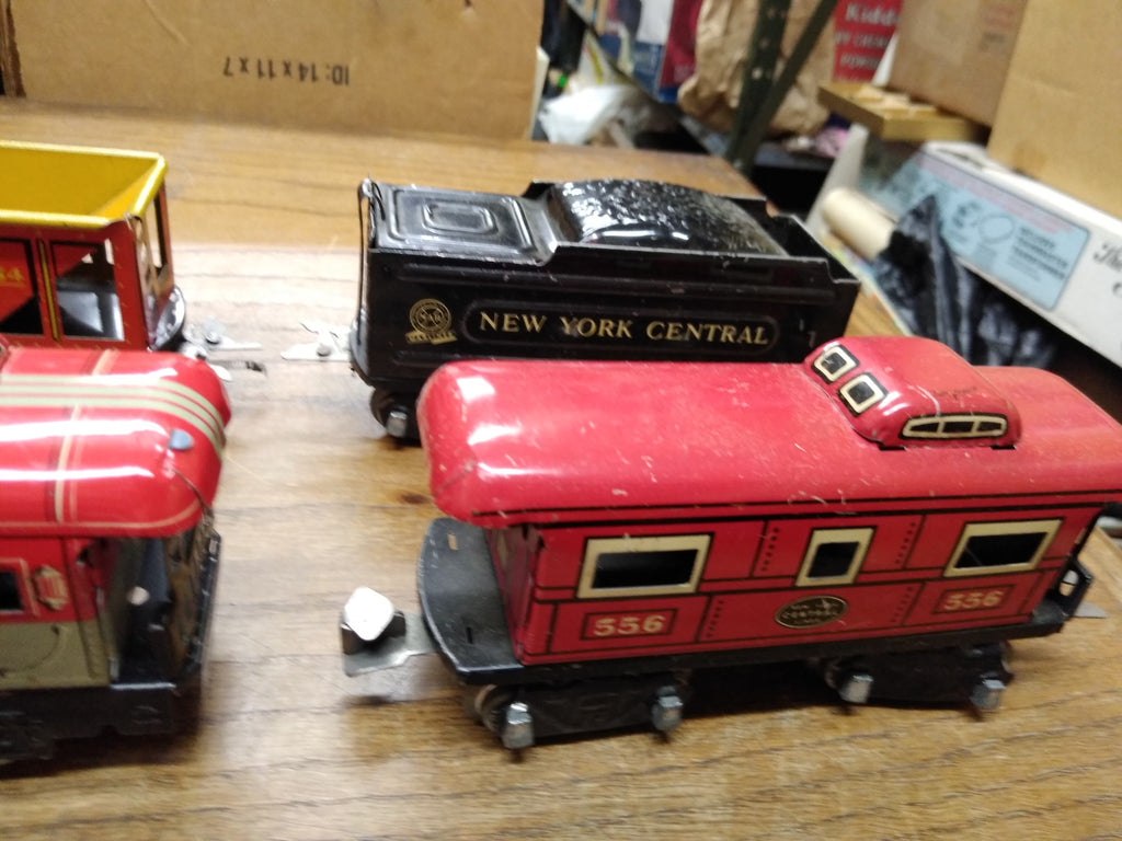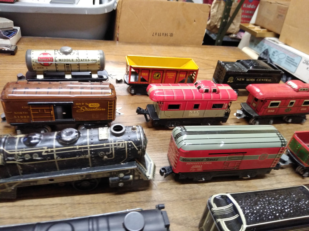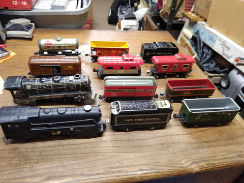 This is a Vtg  Marx Train Set 2 Steam Engines 10 Cars Layout Buildings Background in Box!!!! The Engines are Untested and 1 is incomplete, The cars look very good! The pictures are a substantial part of the description so please examine all the photos and contact me if you have any questions. We will be happy to save you shipping costs by picking this up at our shop. Thanks for looking.   081822-03-RK