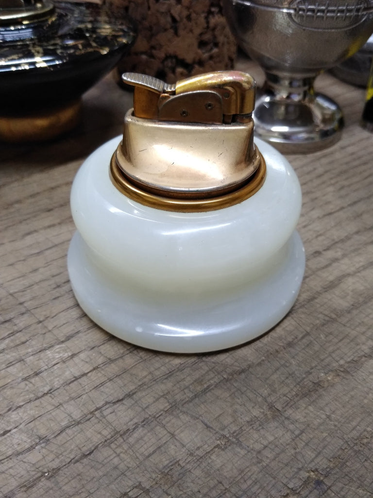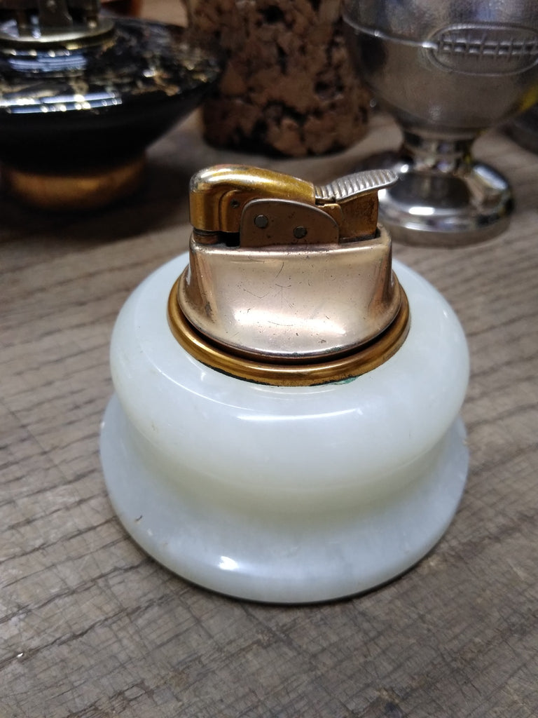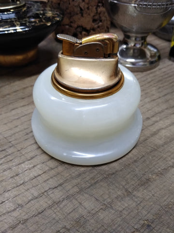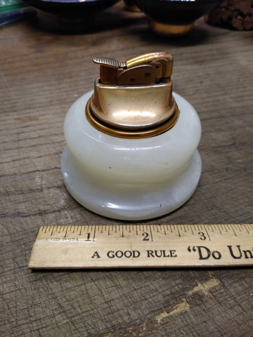 Vtg MCM EVANS Table Top Cigarette Lighter Round White Marble Gold Tone Top USA!